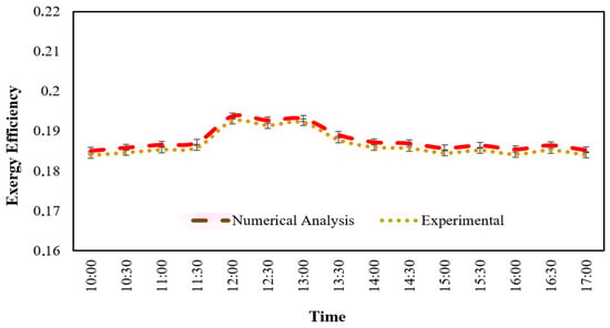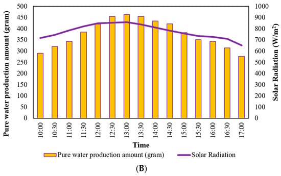 Equation (13) was used for the energy efficiency of the installed PDC distilled water production system, and the following calculations were made for the exergy efficiency. Exergy analysis is frequently performed, mainly in solar energy systems. The exergy output Exo [], exergy input Exi [], and exergy efficiency ɳex [] of the system can be calculated by Equations (16)–(18), respectively.