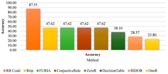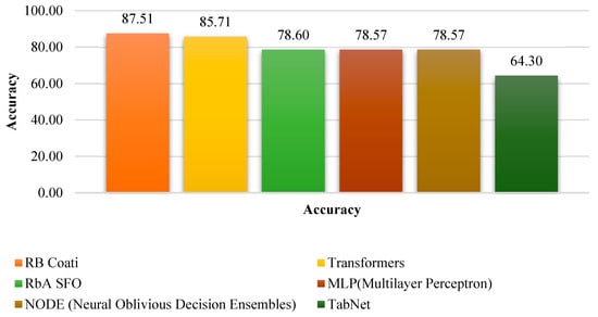 Figure 13 compares the accuracy performance of the proposed RB coati method and some popular machine learning models. As can be seen from the table, the RB coati method achieves the highest accuracy (87.51%) and outperforms both rule-based and modern deep learning methods. This shows that the proposed method can extract highly effective rules from the dataset and increase the classification accuracy. The Transformers-based model performed close to RB coati with 85.71% accuracy, but RB coati achieved slightly better results. The RbA SFO, multilayer perceptron (MLP), and NODE (neural oblivious decision ensemble) methods show moderate performance with accuracies around 78% respectively. This reveals that the proposed RB coati method is more competitive compared to both rule-based and neural network-based approaches. On the other hand, TabNet lags behind the other methods with an accuracy of 64.3%, indicating that TabNet may have a limited advantage depending on the structure of the dataset. Overall, Figure 3 highlights the superiority of the RB coati method in terms of classification accuracy and that it is an effective choice, especially among rule-based models.