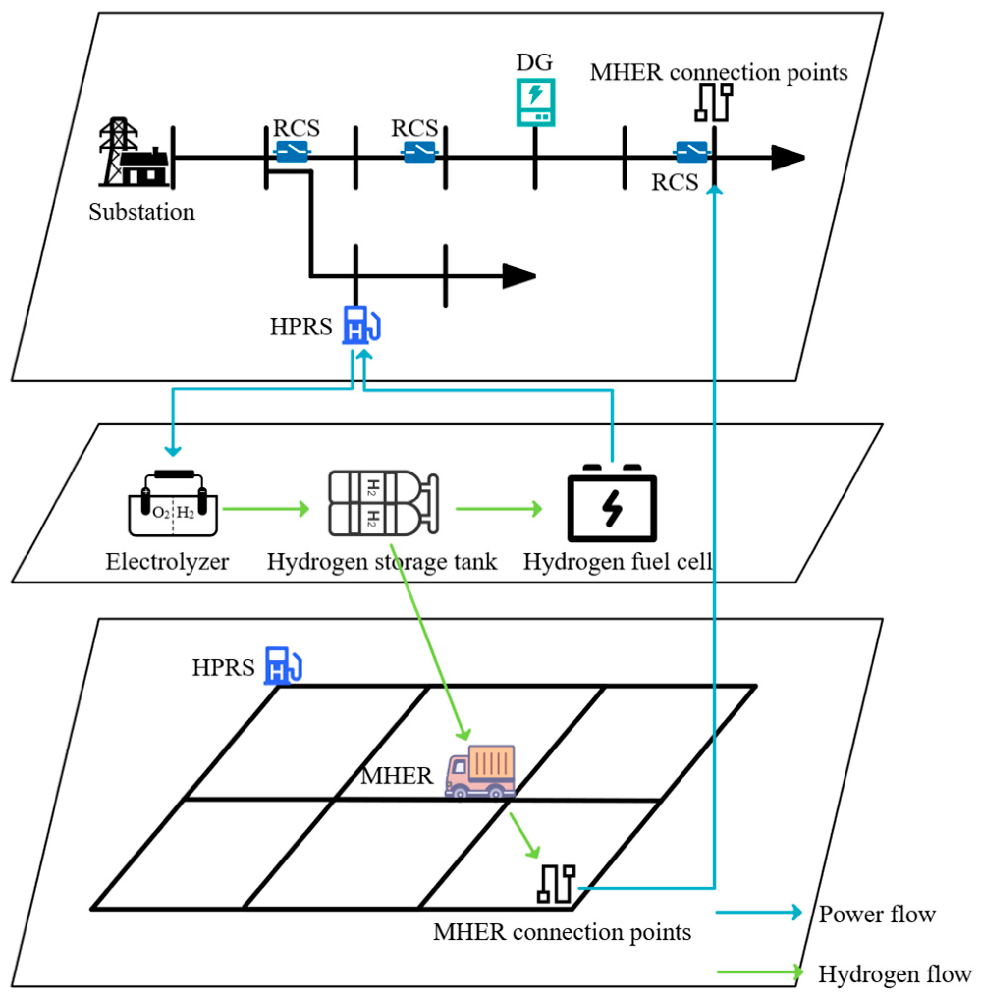 - A coordinated dispatching model for three types of recovery resources (power distribution, transportation, and hydrogen energy systems) is established. The transportation systems enable dynamic dispatching of emergency resources, the hydrogen energy systems provide clean energy storage and allocation, and the power distribution system implements global optimal control.