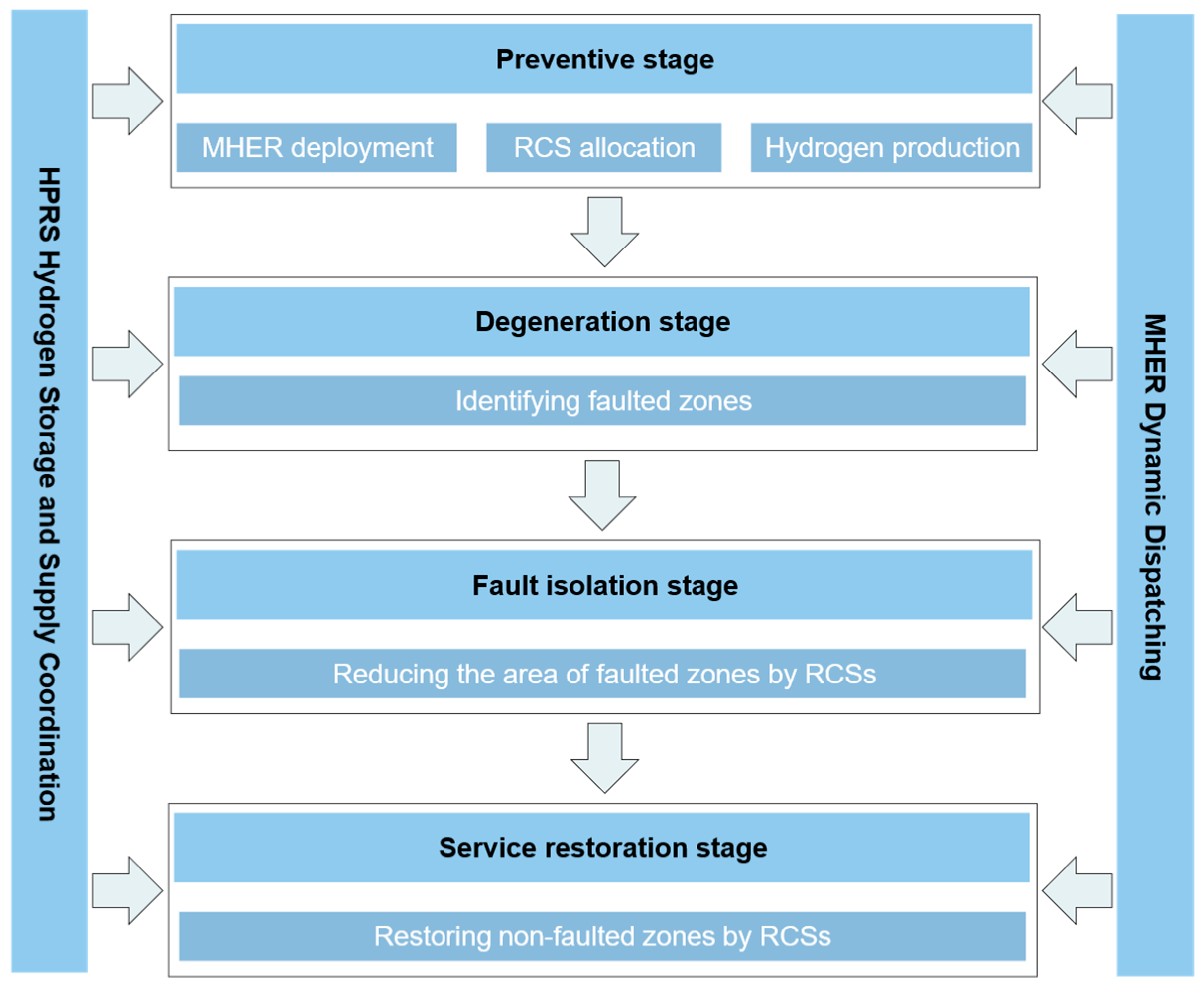 - Based on a multi-stage coordinated framework considering prevention–degradation–fault isolation–power restoration, restoration resources for multiple systems are modeled, achieving coordinated scheduling of diverse restoration resources throughout various stages. During the prevention stage, the system’s capability to defend against extreme events is improved through pre-planned deployment of RCSs and mobile hydrogen emergency resources (MHERs) and by optimizing the distribution network to form preventive islands; after extreme events occur, the response process is divided into detailed stages to achieve precise fault section isolation and rapid power restoration in non-fault zones through coordinated utilization of multi-type resources, such as hydrogen production and refueling stations (HPRSs).