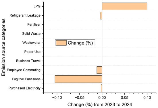 Table 2 summarizes the emission factor updates adopted by the ISO 14064-1:2018 standard, which requires organizational greenhouse gas (GHG) inventories to incorporate the most current and jurisdiction-approved emission coefficients. In 2024, Taiwan’s Ministry of Environment released revised emission factors for several key sources, significantly affecting AU’s GHG calculations across various categories. These changes influenced not only absolute emissions but also the relative contributions of each source category. Figure 3 illustrates the percentage change in emission factors from 2023 to 2024, highlighting the most substantial adjustments observed in liquefied petroleum gas (LPG) and fugitive emissions (refrigerant leakage), with a 5% decrease and a 10% increase, respectively.