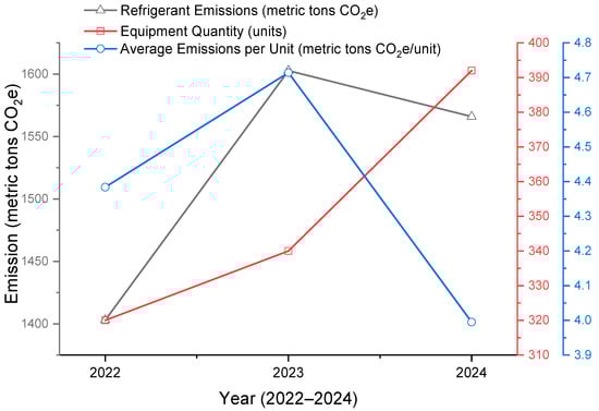 Figure 4 trends in total refrigerant fugitive emissions, number of equipment units, and average emissions per unit (2022–2024). The Figure illustrates that, following initial increases in both emissions and equipment numbers, the implementation of effective management strategies led to a notable reduction in average per-unit emissions in 2024, despite the continued expansion of the inventory.