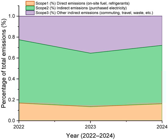 Notably, Scope 1 emissions increased substantially due to fugitive refrigerant leakage, peaking at 1803.15 tCO2e in 2023 before declining slightly in 2024 as a result of improved equipment management. Scope 2 emissions (purchased electricity) remained stable at approximately 5791–5795 tCO2e, continuing to represent the largest share of the emissions inventory. Scope 3 emissions exhibited the most significant year-to-year variability, driven primarily by fluctuations in commuting and business travel.