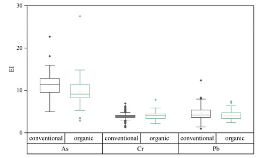 - The PER index of the soil from organic farms in Beijing was below 40, indicating that the soil environment posed a low risk to the quality and safety of agricultural products, crop growth, or soil ecological environments. Compared with conventional agriculture, the EI for As, Hg, Cd, and Pb was also significantly lower in organic agriculture. Moreover, the soil concentrations of As, Hg, Cd, Cr, and Pb were significantly lower than those in conventional agricultural soils. However, moderate Cd risks were observed in 34.38% of the soil samples across all sampling sites, with 1.54% of sites exhibiting a high risk, which suggests Cd accumulation occurred at multiple sampling sites, thereby necessitating continued Cd accumulation risk management in the future.
