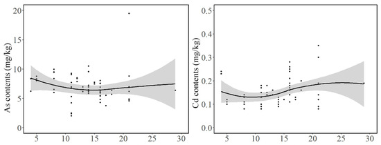 Among the surveyed sites, the planting years ranged from 4 to 29 years, and analysis indicated that planting duration significantly impacted the soil Cd concentration. The Cd concentration reached its lowest point in the 10th year of planting, but an overall increasing trend was observed [42,43,44,45]. Notably, Cd concentration and the ecological risk index were higher from the 15th to the 29th year, suggesting that Cd accumulation occurred on farms with longer planting durations [46]. Cr concentration was slightly decreased with the increasing number of planting years. In contrast, a report by Sun Lingling found that soil Cr concentration increased with the increasing number of planting years, which is inconsistent with the present study [47]. Further analysis revealed that Cr concentration at the sampling sites with fewer planting years was significantly higher than that at sites with a greater number of planting years. However, after removing these sites, there was no significant difference in Cr concentration among the sampling sites with different planting durations [48]. The concentrations of As, Hg, and Pb in the soil did not show significant changes with planting years. This could be because changes in As concentration were primarily influenced by parent material, while Hg and Pb concentrations were mainly affected by atmospheric deposition and traffic factors [49]. Some studies have shown that the variation in As concentration in Beijing soil is mainly affected by soil-forming parent materials [50], while the concentrations of Pb and Hg are mainly influenced by atmospheric deposition and traffic factors [49,51]. Because of strict site selection and production material requirements, organic farms are typically located in villages and do not use pesticides or chemical products, which minimizes the entry of pollutants into the soil [48].