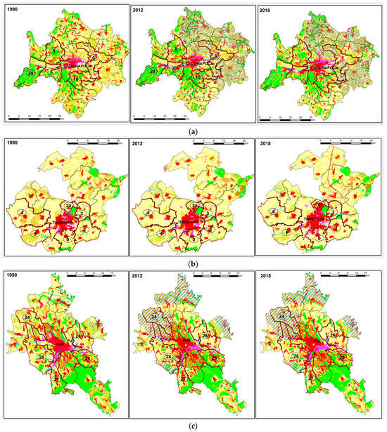 (a,d) CORINE Land Cover databases for the Cluj-Napoca (a), Timișoara (b), Iași (c) and Constanța (d) municipalities and their peri-urban crowns for 1990, 2012 and 2018, which capture the changes in land-use/cover distribution that have occurred over the last 30 years. The Legend for the CORINE Land Cover databases is the same as in the case of Bucharest (Figure 6). (a). Legend for the peri-urban localities discussed: 5—Florești; 8—Baciu; 9—Apahida; 18—Feleacu; 29—Gilău. (b). Legend for the peri-urban localities discussed: 0—Giroc; 7—Chiajna; 1—Sânmihaiu Român; 2—Moșnița Nouă; 3—Ghiroda; 4—Săcălaz; 21—Dumbrăvița. (c). Legend for the peri-urban localities discussed: 24—Rediu; 25—Tomești; 26—Holboca; 27—Ciurea; 28—Miroslava. (d). Legend for the peri-urban localities discussed: 15—Valu lui Traian; 16—Cumpăna; 17—Năvodari; 23—Agigea.