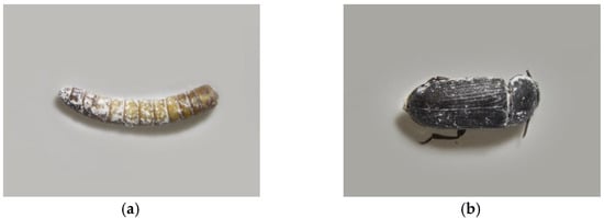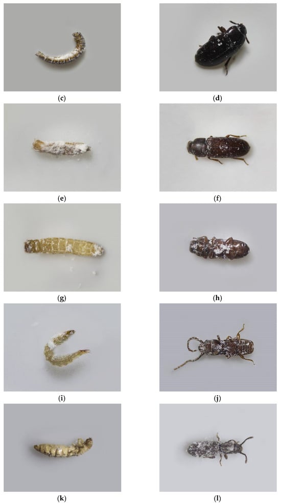 The insecticidal use of DEs dates to 2000 B.C. in China for pest control [34]. Research into their mode of action advanced in the 1930s, revealing that dust particles ingested during insect self-cleaning procedures were toxic [34,35]. Later, DEs were found to cause desiccation upon contact with the insect cuticle [36]. Before this, theories suggested ingestion [37,38], chemical reactions on the cuticle [38,39], or mechanical effects [38] as causes of insect mortality. The rate of dehydration, influenced by epicuticular absorption and DE particle size and shape, was crucial [40]. Initially, DEs were thought to disrupt the epicuticle, but later, their role in absorbing the cuticular wax was identified [41]. In Figure 1a–r are presented various coleopterans of stored products (adults and larvae), such as Tenebrio molitor L., Alphitobius diaperinus (Panzer) (Coleoptera: Tenebrionidae), and Cryptolestes ferrugineus (Stephens) (Coleoptera: Laemophloeidae), that have died after 24 hours (h) of exposure to DE Insecto, having their bodies covered with dust/DE particles. It has been reported that the attached particles of DEs to the insects’ bodies can reduce their movement and block tracheae, spiracles, digestive tract, and genital systems, which can affect sexual interaction and progeny production, as well as prevent other essential operations (e.g., vision and signaling) [1].