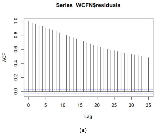 A time series model ([22], Chapter 12) was fitted because both the autocorrelation function (ACF) and partial autocorrelation function (PACF) plots of the OLS regression residuals indicate temporally correlated data, as seen in Figure 3a and Figure 3b, respectively. Temporally correlated data mean that two observations closer in time are much more similar (after adjusting for covariates) than two observations further apart in time. Therefore, an autoregressive integrated moving average (ARIMA) time series model [32] was fitted to the WCF nighttime air temperatures, whereby an ARIMA(p = 1, d = 1, q = 3) model provided temporally uncorrelated residuals. It is not surprising that a differencing component (d = 1) is needed in the ARIMA model, given the presence of long-range correlation, as seen in the slow decay of the autocorrelation in the ACF plot of the OLS regression residuals in Figure 3a. The ARIMA time series best-fitting model adds five extra parameters (an autoregressive term and three moving average parameters for sequentially differenced data) over and above the OLS regression model.