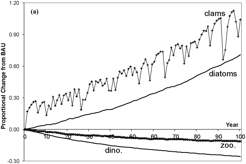 The trend lines in Figure 3 display proportional changes from BAU for selected ecosystem variables over 100 years, and Table 3 contains the average annual percentage changes in immobile deep channel and mobile species populations (shallow population changes are small and omitted from the table). The erratic patterns in the lines are due to the random N levels. First, inspect the consequences for immobile populations in the deep channel (top figure). As N loading is reduced diatoms are able to outcompete dinoflagellates for exposure to light, causing a substantial decrease in dinoflagellate biomass. In turn this reduces SOD, which causes DO in the deep channel to climb, with beneficial physiological impacts on clams, croakers and blue crabs. But, with the rapid rise of diatoms and decline of dinoflagellates, the zooplankton population falls. While there is an increase in one of zooplankton's prey populations (diatoms), this benefit is more than offset by both the decrease in their other prey (dinoflagellates), and by the rapid increase in clams (under less stress from O2 depletion) that compete with zooplankton for diatoms. Following diatom populations, clams increase substantially as they prey only on diatoms and they are released from the physiological stress under BAU. Jellyfish (omitted from Figure 2) mirror their zooplankton prey population and decline.