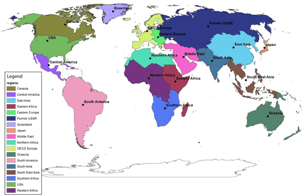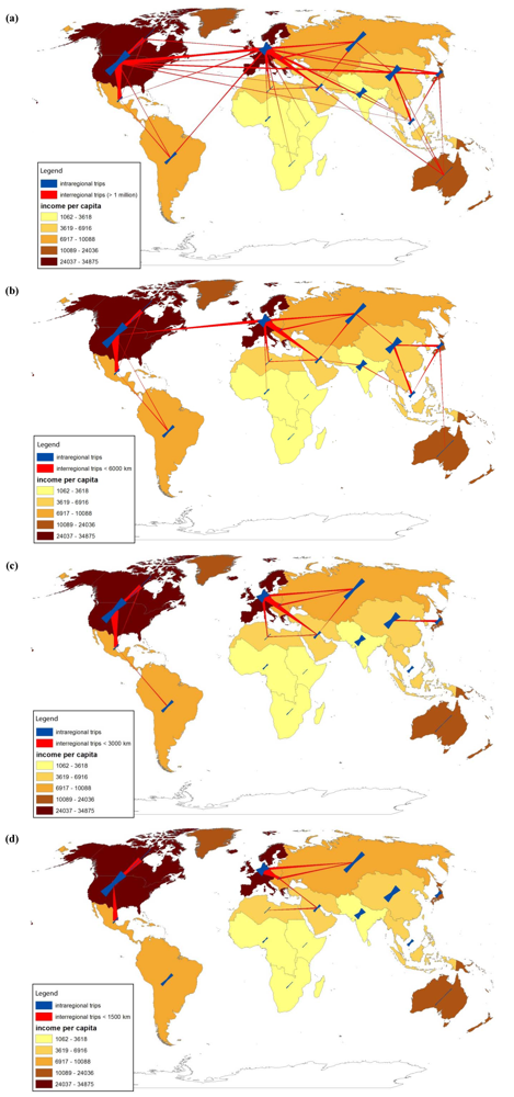 However, these impressions are incorrect due to some serious caveats underlying the use of only international flows, as outlined in Section 3. First, international flows represent only 17% of all tourism trips as they ignore the 3.89 billion domestic trips (see Section 3.1). Second, international flows are based on flows between very uneven geographic entities, nation states, which are the main cause of the high density of flows in Europe and relatively small flows in North America and Asia. Therefore, we introduced a geographical division of the world that is based on the IPCC scenarios and gives a fairly equal mix of global population, economy and surface area [41].