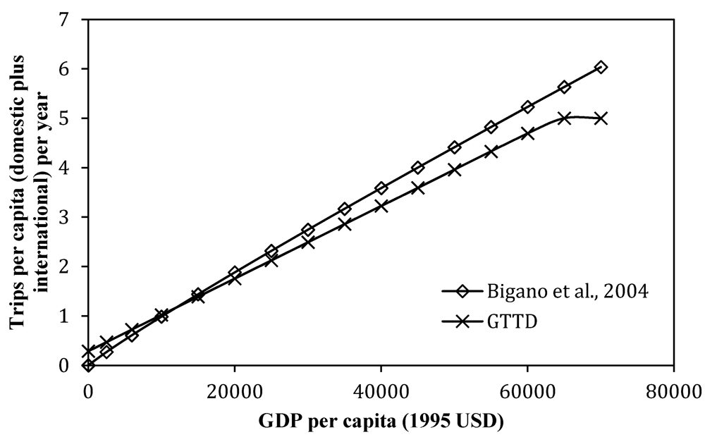 Relations between GDP and trips per capita for the GTTD and Bigano [38].