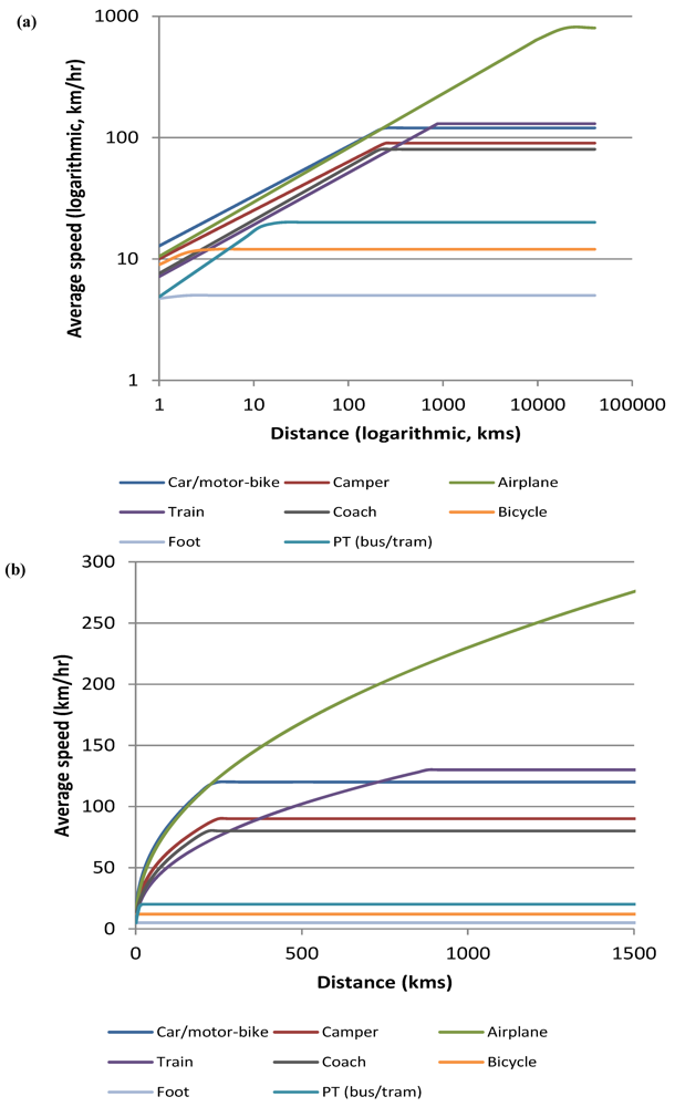 Unfortunately, global travel time data for tourism travel are non-existent. Therefore, a relationship between travel distance and travel is suggested to impute speed to the most common travel modes, as already proposed by Miossec in the 1970s [15]. Using the Mobility Survey Netherlands (MON [61]), Figure 3 has been constructed. MON contains detailed data for 200,000 trips per year generated by 60,000 subjects. The focus of this survey is daily transport and most long international trips are missed. However, it is assumed that the way tourists use transport modes will not fundamentally differ from daily travel. The measured travel speeds were best represented (i.e., highest R2) by the power law model given by Equation (3), where V is the speed in km/hr, d the distance in km and CV and b1 are the model constants estimated with PASW Statistics 18.0.
