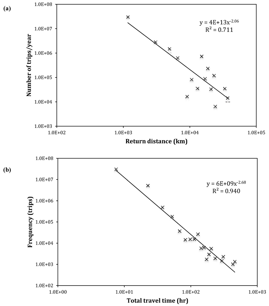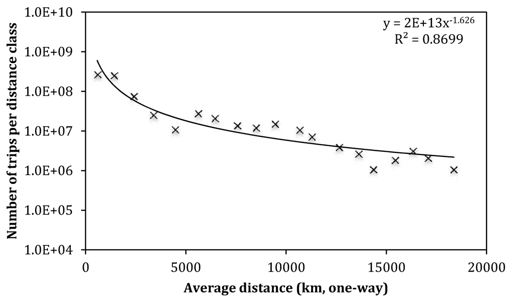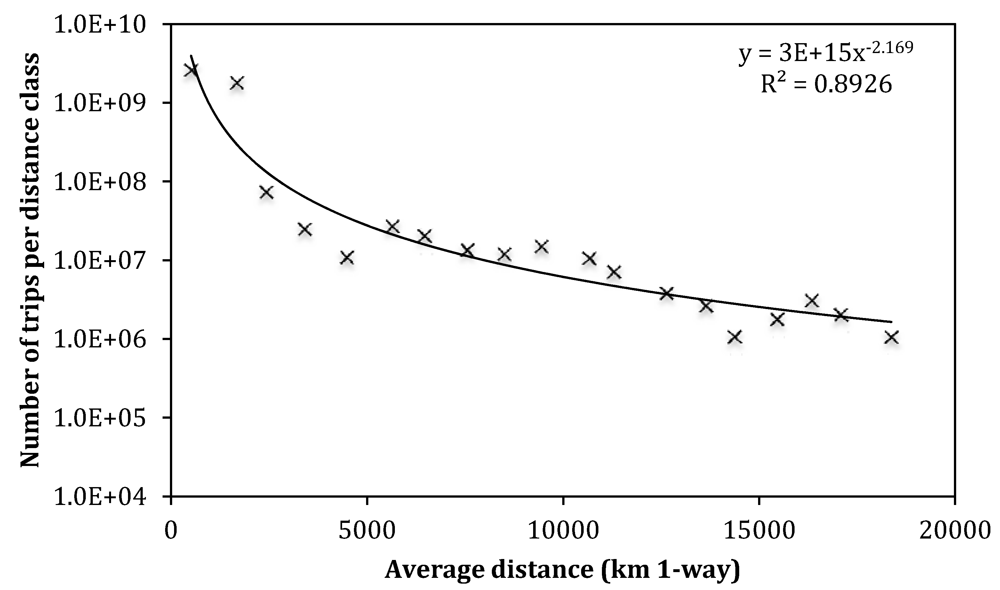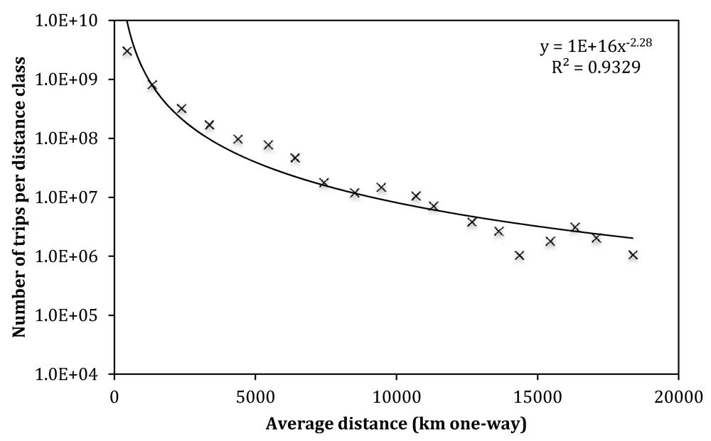 With the method described above, we know the number of domestic trips and the average distance travelled at the scale of nations. This information increases the total distance travelled in the world from 3.72 × 1012 billion pkm to 11.36 × 1012 billion. The new distance decay results for global tourism are given in Figure 6.