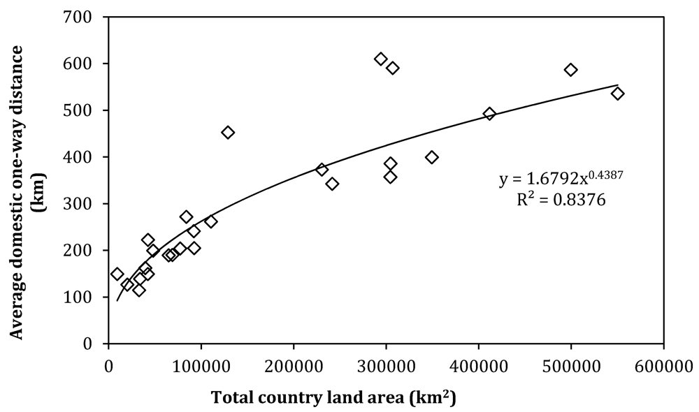 The average distance domestic tourists travel will mainly be a function of the size of the country and to some extent the quality of the infrastructure. Based on data from the MuSTT study [90] we drafted a relation between the average domestic distance and the size (the area of land surface in km2) and fitted a curve to these data (see also Figure 5):