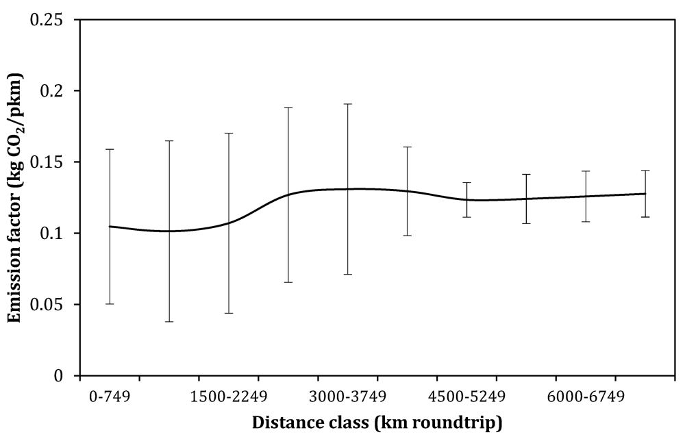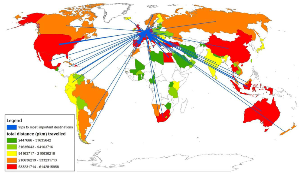 The UNWTO data fail to provide consistent and complete information about domestic tourism, transport mode and distances travelled. The ‘transport’ element of the GTTD was added by calculating the ‘great circle distance’ between all countries using the “Great Circle Mapper” [42] and the airport codes for the main airport of each country. For country pairs between neighboring countries with at least one very large country, we replaced the airport in the large country with one nearer to the border between the two countries. This correction kept large numbers of arrivals from being assigned to too large distances. A total of international distances (round-trip) of 3.720 × 1012 (pkm) was found, or an average one-way distance of 2,531 km. This distance is 23% higher than the only other published global estimate of 2,051 km [2]. Significant uncertainties remain in both sets of numbers.