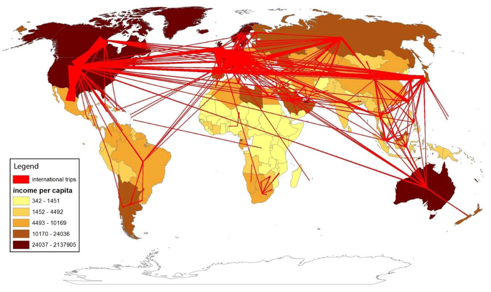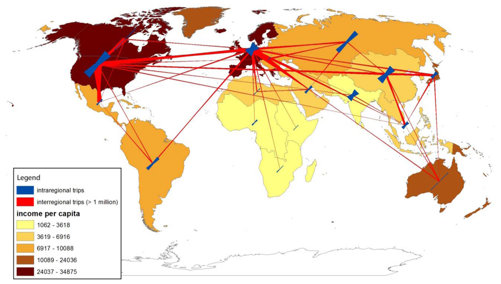 The main international tourist flows in 2005 and income per capita (for 2003 in 2000 USD; based on GTTD).