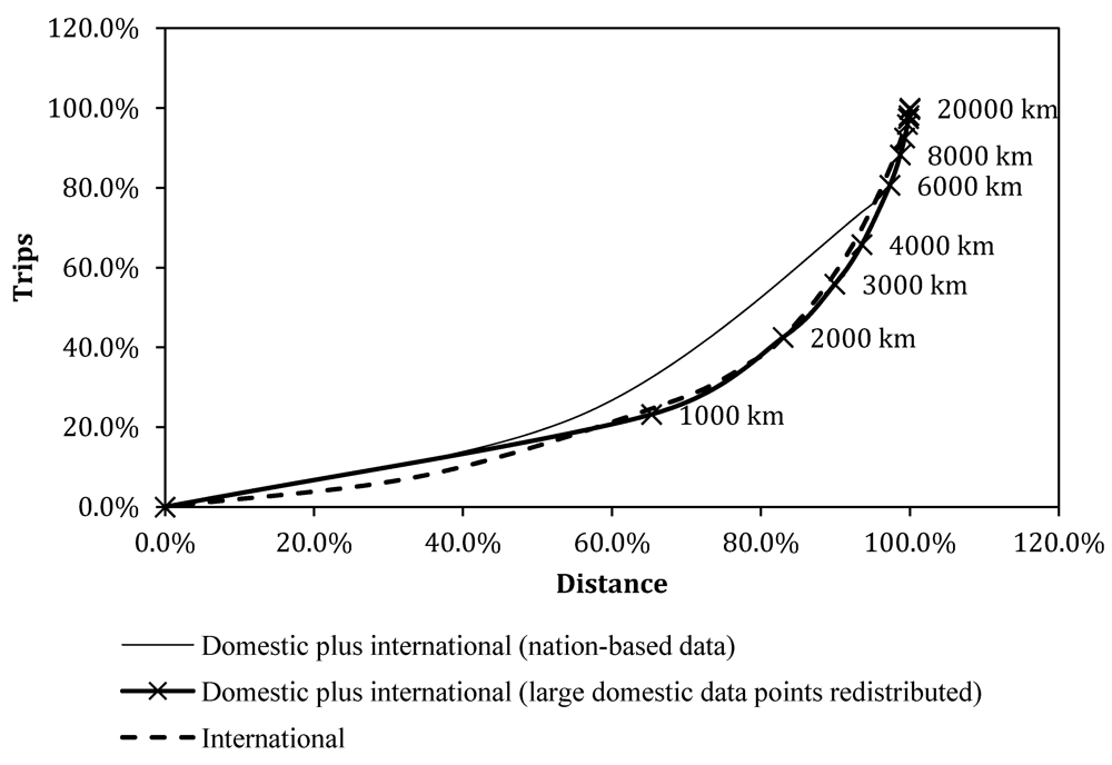 Clearly the ‘power curve’ fit improved (see Figure 7), although it appears to be following two separate power curves: one in the domestic domain of distances and the other in the medium to long haul international domain. Without better national tourism data it remains unclear if the imputed domestic distance class distribution is realistic.