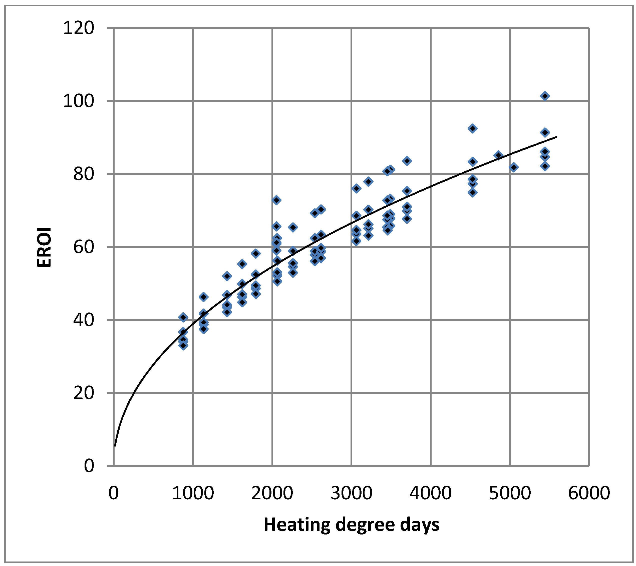 The data from these studies [63,64,65] have been normalized to a 50 years lifetime (Figure 2). In addition, to reduce the dispersion of the data points, the analysis has been limited to the cases were polystyrene was used as an insulator. Therefore, in Figure 2, five curves from [64] can be found along with an extra vertical one that corresponds to an analysis with different fuel for on specific climate [65]; three others points come from [63]. The residual dispersion comes from the economic assumption at the basis of the optimization and the original uninsulated wall thermal resistance. From each set of points reported, the square root relation between heating degree-days and the EROI can easily be observed.