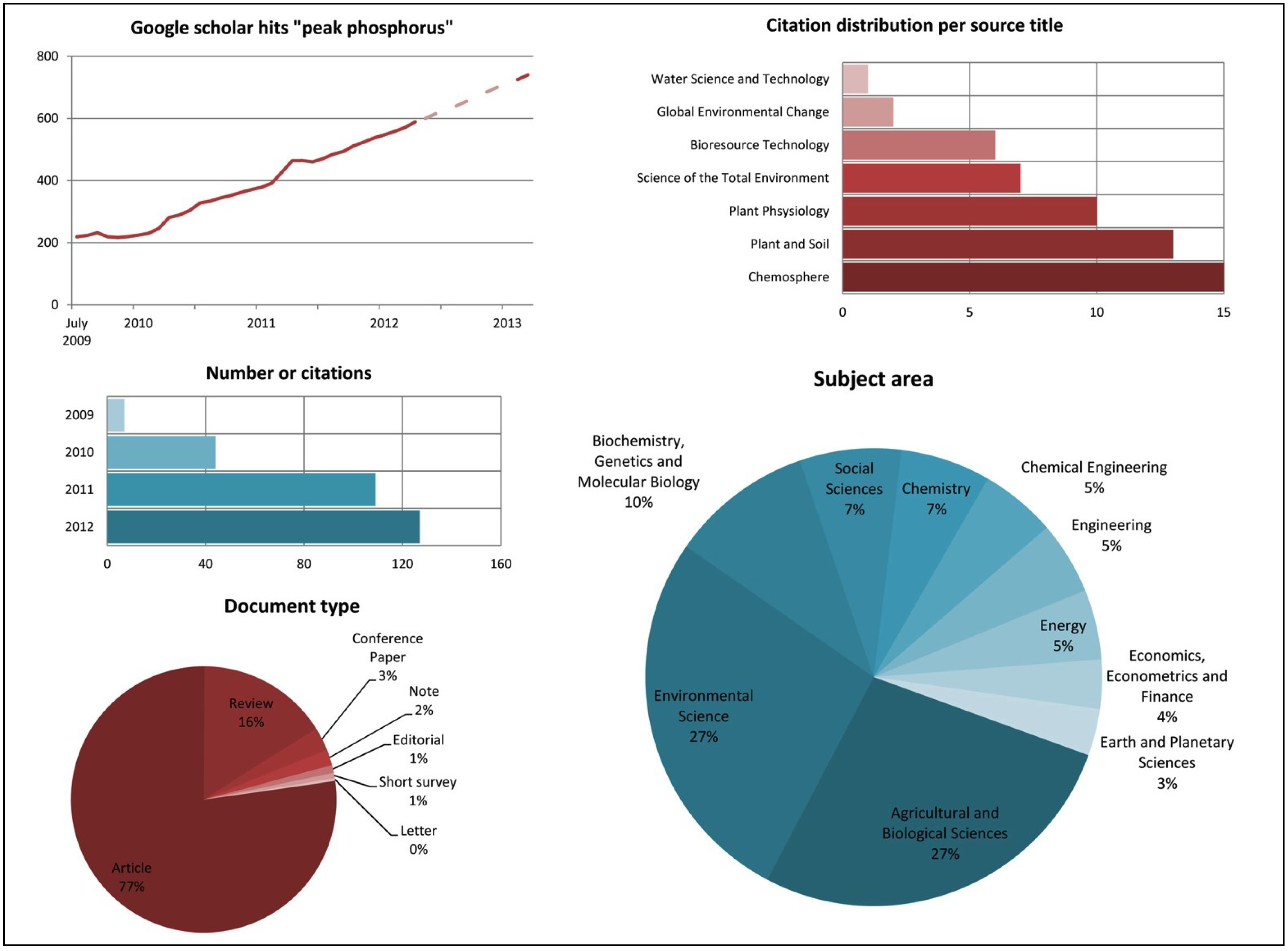 Multi-aspect citation analysis of the paper “The story of phosphorus: food security and food for thought” by Cordell, Drangert, and White [1] and impact of P scarcity in the scientific community. Figures illustrate the number of citations (2009–2012: 287), the citation distribution for the top seven source titles, the document type, and the variety of subject areas in which the paper was cited [13]. The chart “Google Scholar hits” tracks the emergence of “peak phosphorus” in the scholarly literature from June 2009 (219 hits) to March 2013 (749 hits; hits for the time period between May 2012–—601 hits—and February 2013 are extrapolated).