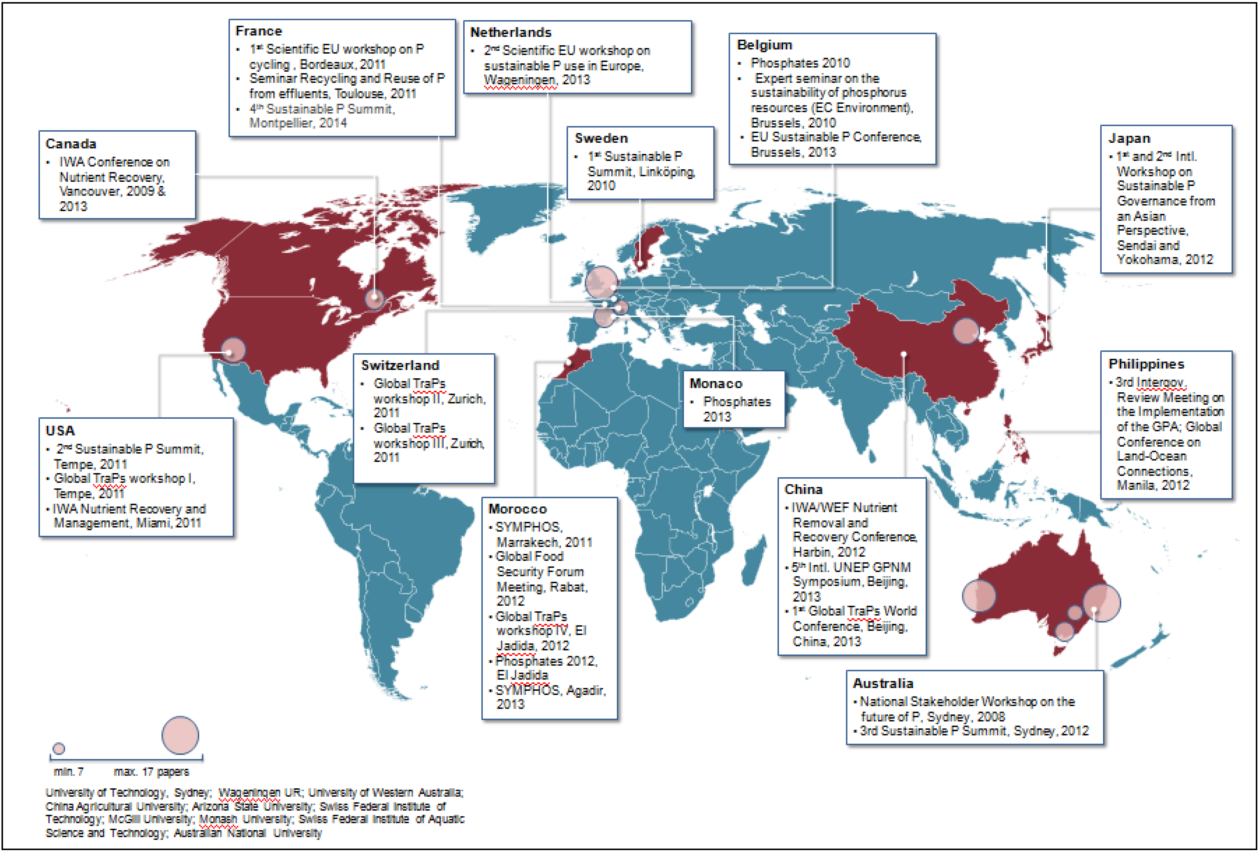 Figure 2 shows the landscape of selected key events from 2008–2014 and illustrates centers of academic P sustainability research. As can be readily seen from the combined components of Figure 1, the paper received wide attention in a variety of scientific fields. This visible diversity may serve to illustrate how broad the topic is. As citations are frequently used to indicate the impact of a study, the large and increasing number of citations the paper received in Scopus suggest a clear growth trend of the topic. Similar conclusions can be drawn from the growing list of “peak P” hits in Google Scholar. In addition, the visualization of Figure 2 gives an overview of world regions where P sustainability is of growing interest. Countries in red represent places that have recently held conferences or meetings relevant to P sustainability. Circles represent geographical “hot spots” in academic P sustainability research. In general, the observed patterns suggest distribution on all continents; however, there is a clear predominance in developed countries.