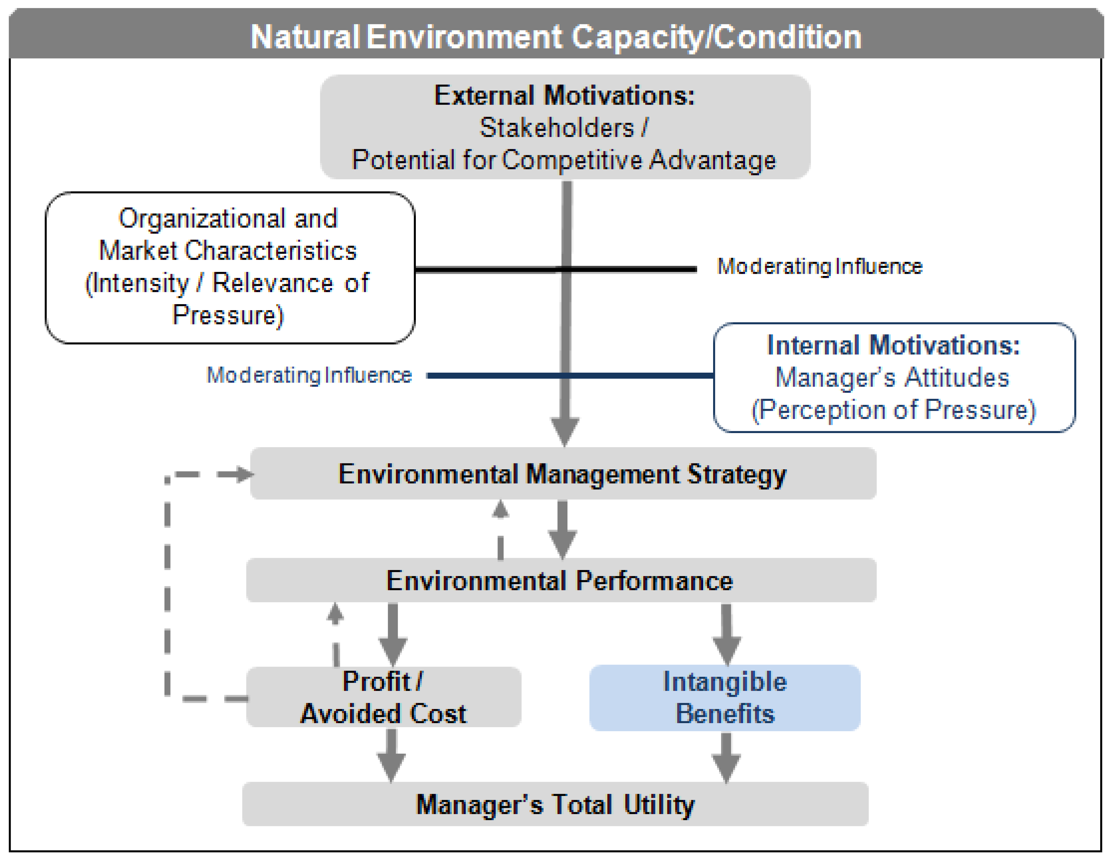 This paper draws primarily on economics, and secondarily on strategic management literature, integrating concepts to create a comprehensive discussion of moderating influences on environmental management. Although this discussion emphasizes economic theories and findings, Rumelt, Schendel, and Teece (2009) [30] note that strategic management literature has drawn heavily on economics, and the intent is to provide insights useful to both lines of inquiry. The next section reviews institutional determinants and moderators of environmental management when profit maximization is the assumed objective. Section 3 describes a conceptual model combining institutional theory and utility maximization. Section 4 presents empirical studies incorporating management attitudes as a moderating factor. Section 5 provides a brief summary discussion, and Section 6 concludes that our understanding of business environmental management may be enhanced by integrating analytical frameworks, and specifically examining managers’ attitudes.