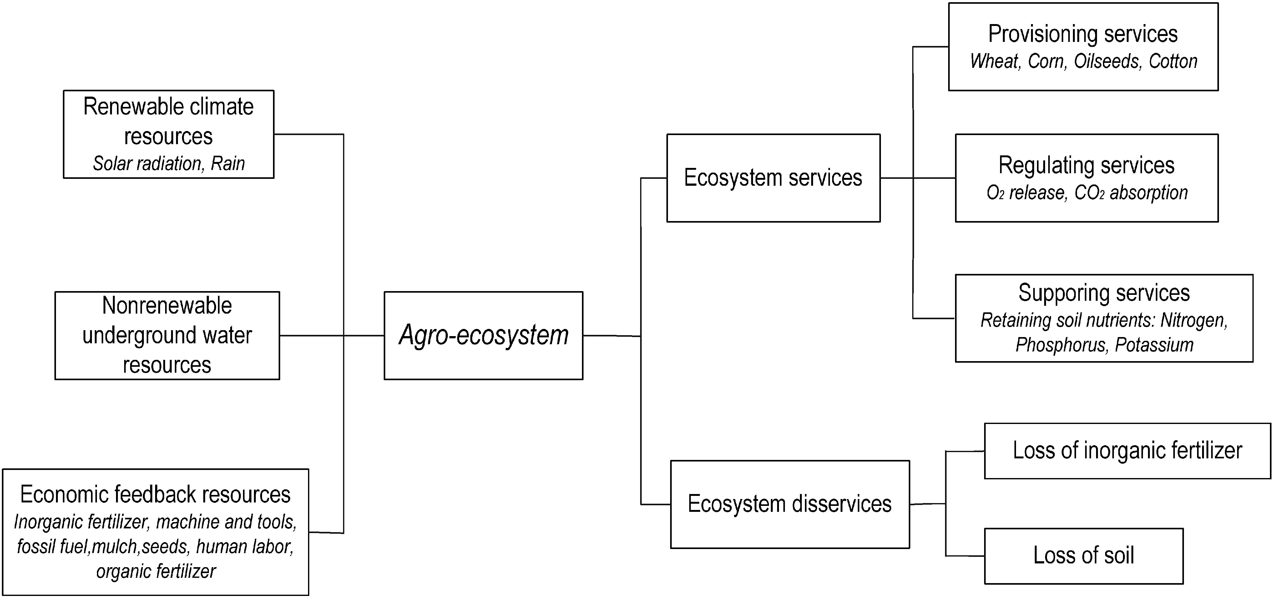 Separately measuring the components of ecosystem inputs and outputs adds clarity to ecosystem evaluation and can enhance the recognition of the relationship between the ecosystem and human beings. The ecosystem inputs refer to the resource consumption by the ecosystem while the ecosystem outputs include the ecosystem services and disservices. Since this study focused on the agro-ecosystem, the components of resource inputs include renewable climate resources, the nonrenewable underground water resource, and purchased renewable and nonrenewable resources from human economical feedback. Underground water is separated from renewable resources because the groundwater resource is yearly over-exploited and the recharge rate is much less than the exploitation rate. Groundwater could not therefore be classified under renewable resources. We divided the ecosystem services outputs into provisioning services, regulating services, and supporting services. The ecosystem disservices outputs included the loss of inorganic fertilizer (classified under provisioning disservices) and loss of soil (supporting disservices).