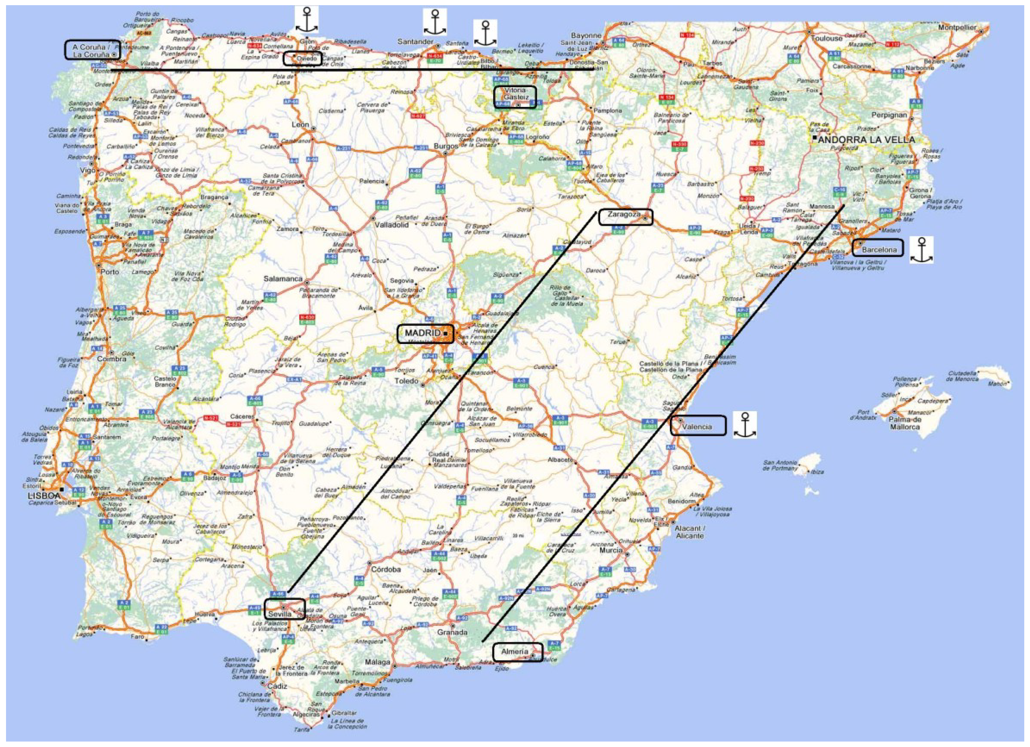 Within the European context, the Commission’s 2011 white paper on transport policies, entitled “Roadmap to a Single European Transport Area—Towards a Competitive and Resource-Efficient Transport System,” sets out guidelines for transport policy until the year 2050. It contains interesting details on the future of the freight transport sector, particularly with regard to forthcoming infrastructure and transportation policy priorities of European governments. The document clearly states that the transportation system is unsustainable and needs to be changed, as it cannot continue to develop along its present lines. In the same vein as the previous white paper, published in 2001, intermodal transportation is understood to be crucial, and the integration of different transport modes are seen as a way to ensure sustainable and efficient transport systems. In today’s context of increasing exchanges of products and services, the European Union’s transportation policy prioritizes railways and short sea shipping (SSS) as complements to road transport, which generates high external costs, both in environmental terms and through traffic congestion, noise, accidents, and so forth. Indeed, the estimated growth in European freight transportation would saturate many road infrastructures if this increase were mainly absorbed by road transport. In the case of Spain, transportation of goods by railway is relatively insignificant, with a market share of less than 4%. In contrast, SSS currently appears to be growing in significance, especially through the so-called Motorways of the Sea (MoS). Although today most of the research recognizes environmental impact as an attribute giving sea transport an advantage over road transport, recent studies [18,19] are beginning to question this assumption. In this vein, the need for analysis of the environmental impacts of both modes for specific routes has been highlighted.