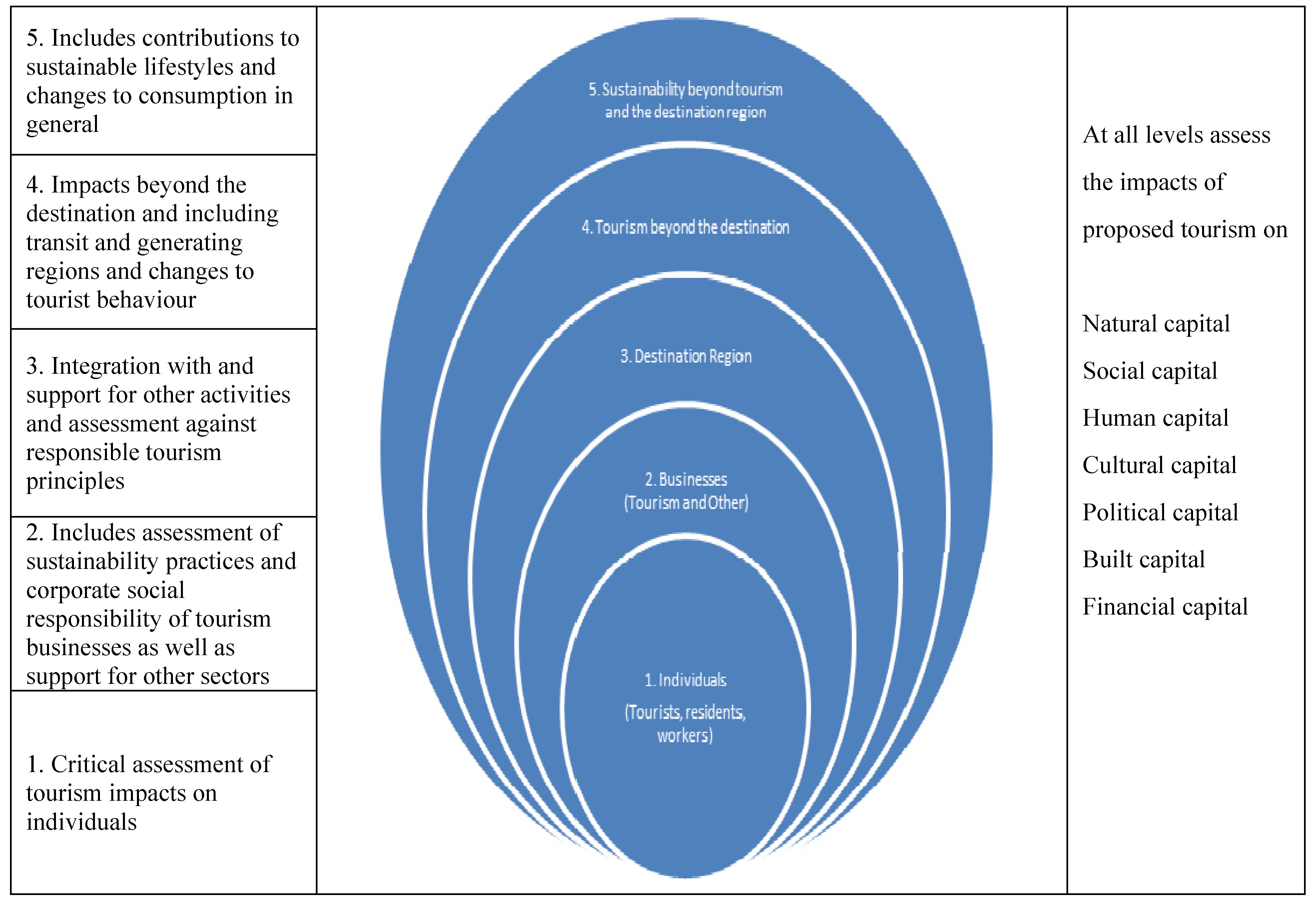Moscardo, for example, proposes a QoL framework for considering tourism impacts that suggests that different types of tourist activity can be assessed according to their positive and negative impacts on each of the capitals listed in Table 1 [21]. Of importance to the present discussion is that this framework also argues that the assessment needs to be done at several levels including the individual tourist, stakeholders in the regions that tourists leave, stakeholders in transit regions, stakeholders in destination regions, and the people who work in tourism [21]. According to this framework ST has to result in net benefits across all the types of capital for the individual tourists, the generating, transit and destination communities, the people who work in tourism and more globally. This recognition that tourism exists simultaneously at multiple levels is the third theme in suggested new directions for ST [7]. The argument here is that assessment of tourism impacts must not be limited to the destination level. The growing literature on the contributions of tourism to climate change [31] is a clear example of how tourism impacts extend beyond the destination. In a similar fashion it could be argued that tourism that exploits the global North–South divide by offering experiences in the global South based on the lower costs resulting from lower standards of living is also not sustainable in a global sense [7,32].