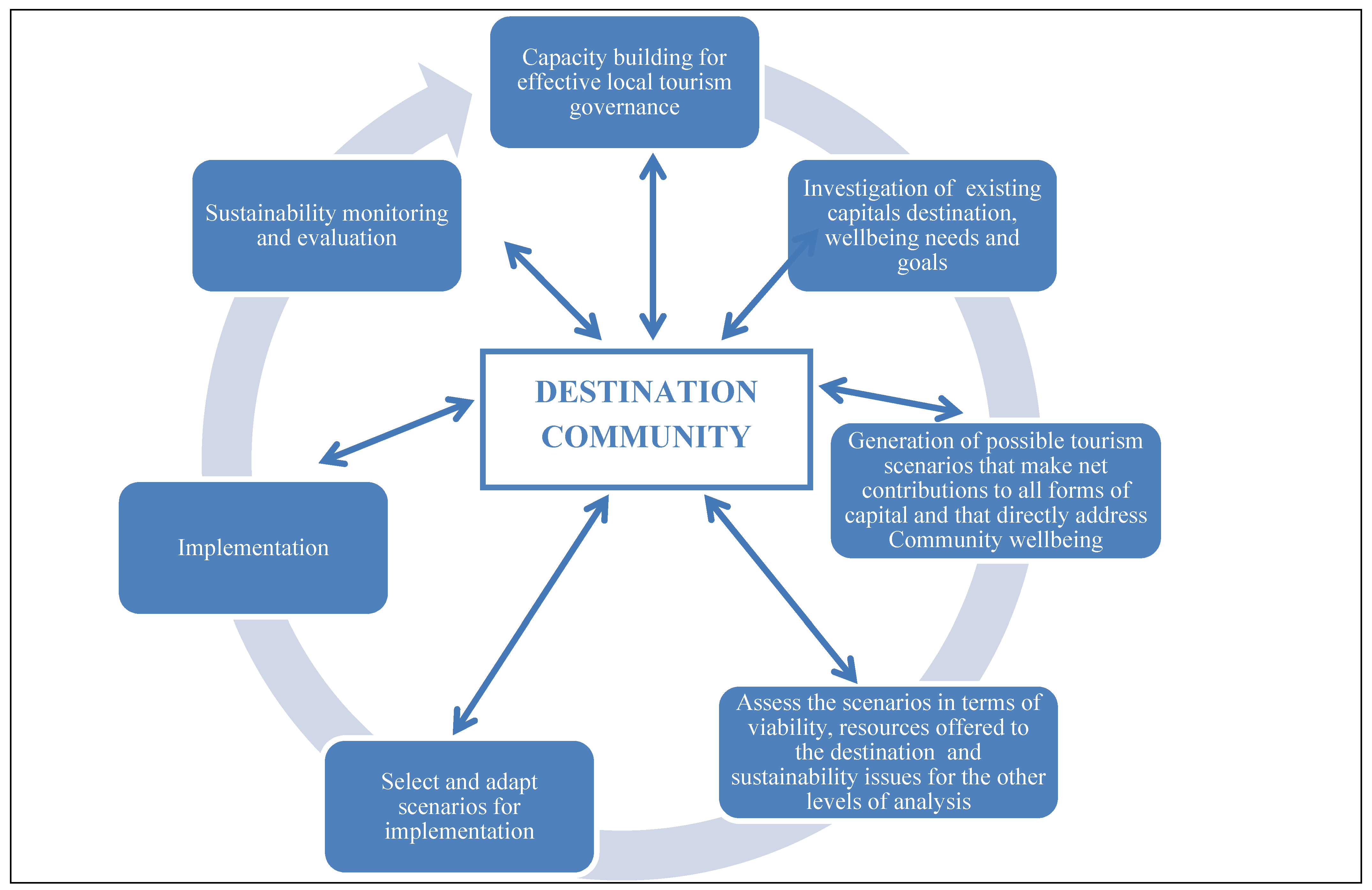 As destination communities develop their capacity for tourism governance, the CW framework re-conceptualizes tourism as a tool for destination stakeholders and sets the main goal of tourism planning as supporting improvements in wellbeing for destination communities and achieving improvements to sustainability at a number of levels. Instead of assessing the resources available for tourism, this approach argues for an assessment of the stock of the various capitals available to destination residents, and the major sustainability issues that face the destination. The aim being to determine the destination needs rather than tourist attraction potential. Once these needs are identified, the process moves to the generation of tourism options that might address these needs. This requires the use of futures scenario building techniques that are not often used in tourism planning [43].