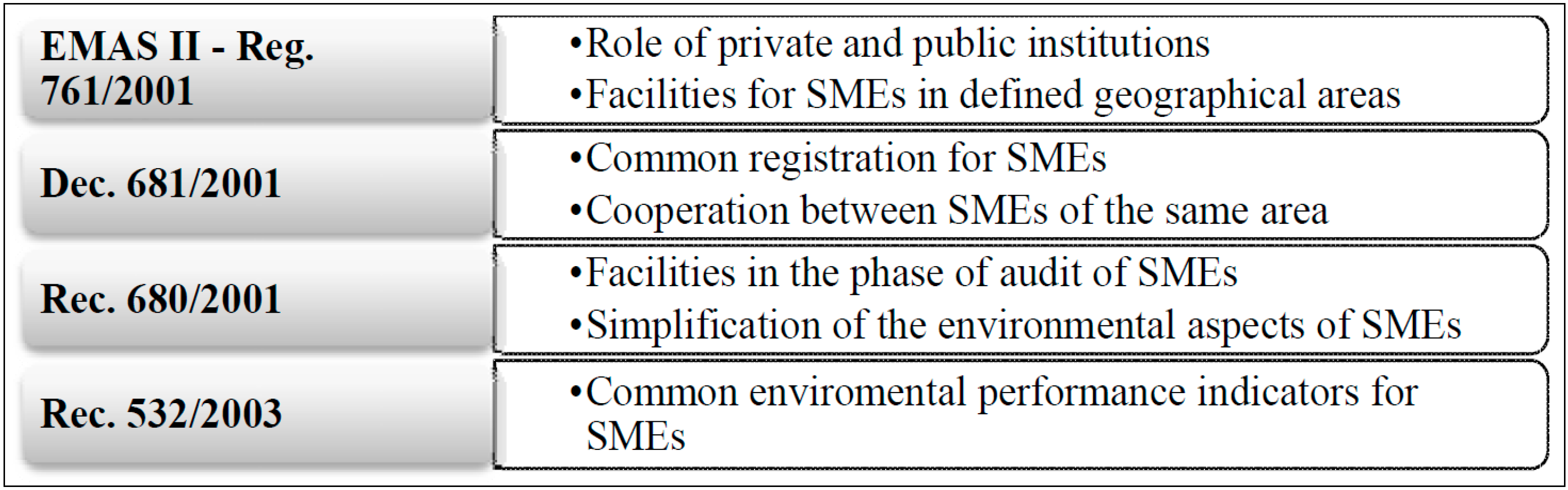 Even though it is not explicitly mentioned in the Regulation, SMEs concentrated in well-defined geographical areas can be compared to Italian industrial clusters. For this reason, the facilitation of EMAS diffusion by a systemic and collaborative approach assumes great importance for Italy.