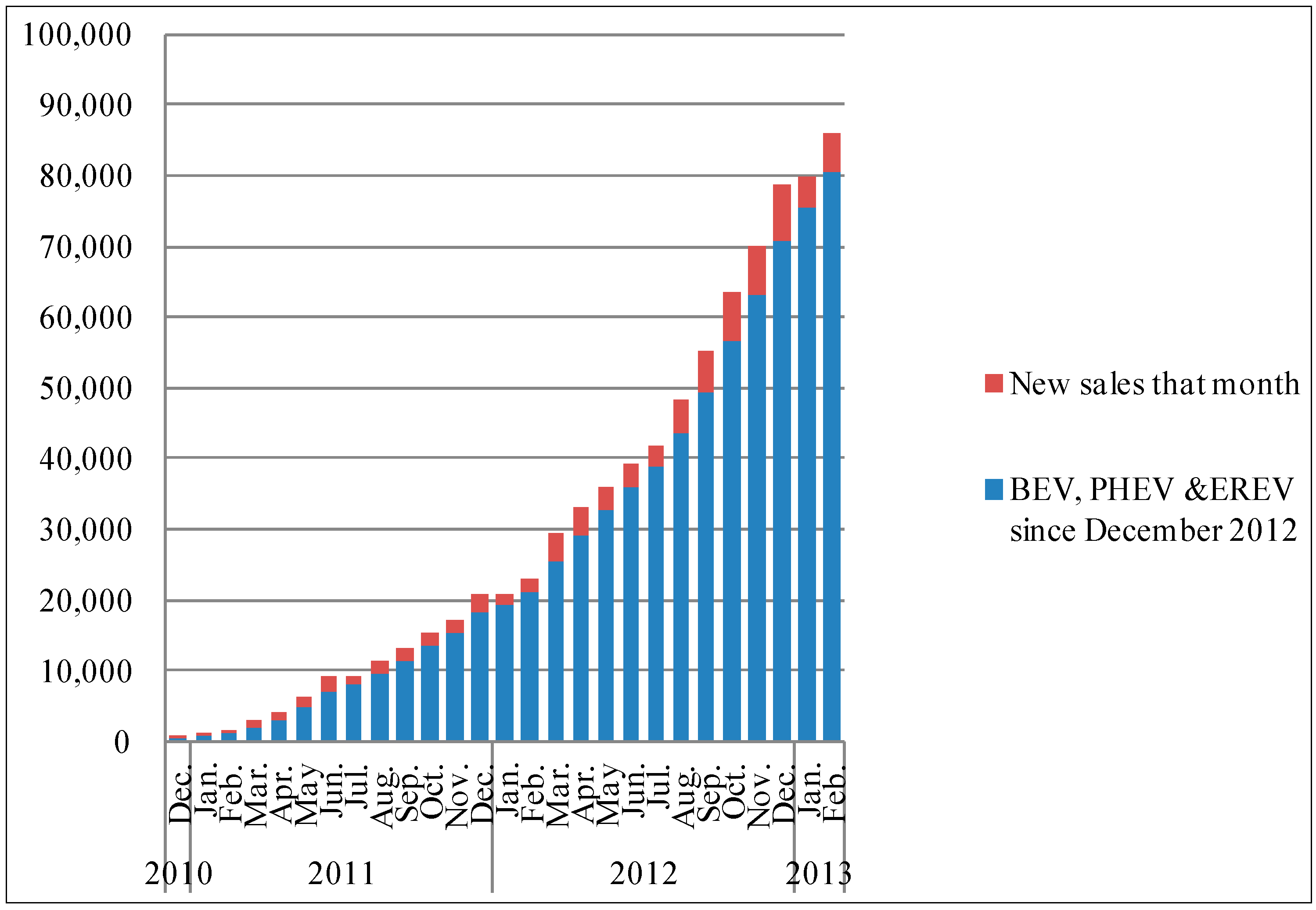 For these purposes, many countries start to promote energy storage technologies and carry out policies to introduce EV into daily life. EV industries are growing fast in many developed countries, such as the United States, the European Union, and Japan. Based on the 2012 fiscal budget, the United States provided 30 communities $10 million in total for EV deployment. Its EV market has made remarkable progress, as presented in Figure 1. The United States is the largest share of the worldwide PHEV market, due to the predominance of the Chevrolet Volt. The country is targeting the deployment of over 22,000 chargers, including 350 fast chargers by 2014 [7].
