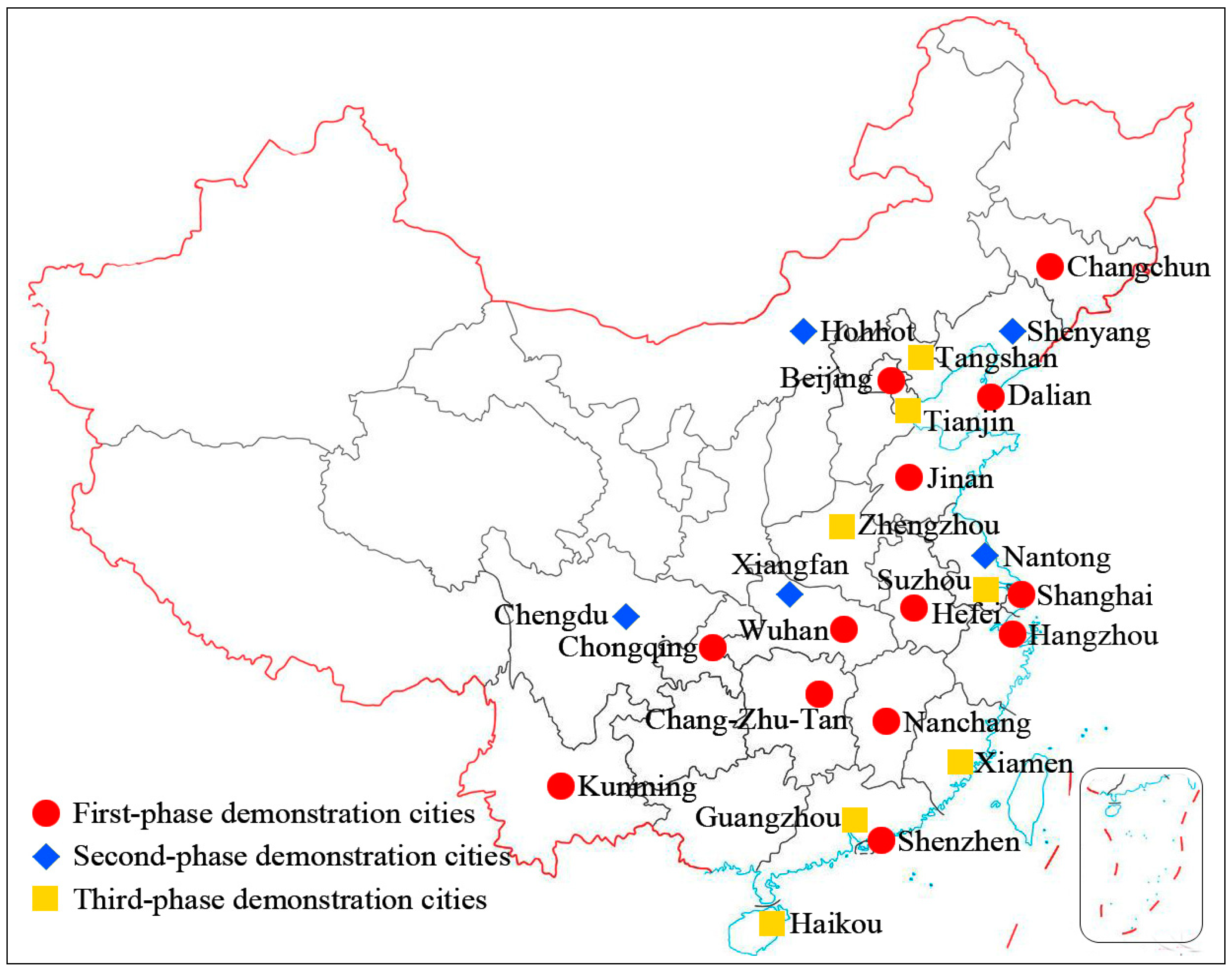 Since the “Ten Cities with Thousands of EVs” program was launched (Figure 3), there has been great progress in the popularization of electric vehicles including BEV, HEV and fuel cell electric vehicle (FCEV). The program proposed 13 pilot cities at first, most of which are representative in a province. These cities drove the program by influencing its surrounding areas. So far, 25 cities have entered the program to push forward the popularization of EV. In the light of statistics released by the government at the end of 2012, 24,800 motors listed in the Directory of Energy Saving and Electric Automobile Types for Demonstration Application Engineering Recommendation had been produced, with an annual growth of 94%. Besides, the ownership of electric passenger vehicles had risen to 14,700, and commercial ones had reached to 10,000 above. According to different vehicle types, statistics of EV sales were listed: 13,300 BEVs, 10,400 HEVs, and more than 1000 PHEVs [11].
