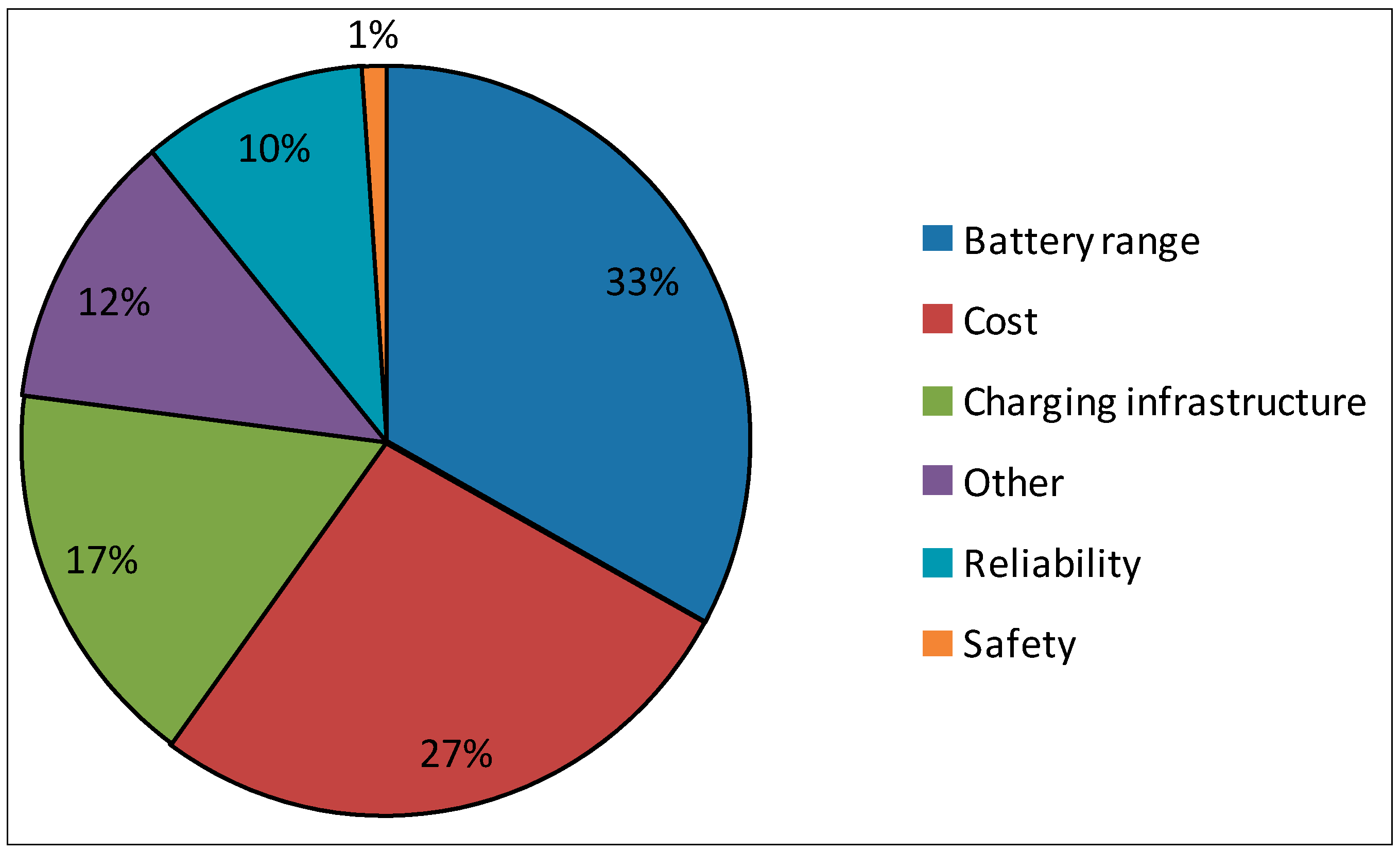 The customer attitude towards EV becomes a crucial barrier in the development of electric vehicle industry. The main concerns of American customers shown in Figure 5 include battery range, cost, charging infrastructure, reliability and safety. One third of the customers think battery range is the crucial problem which will influence their purchasing behavior. Reliability and safety have less percentage compared to electric vehicle cost and battery range.
