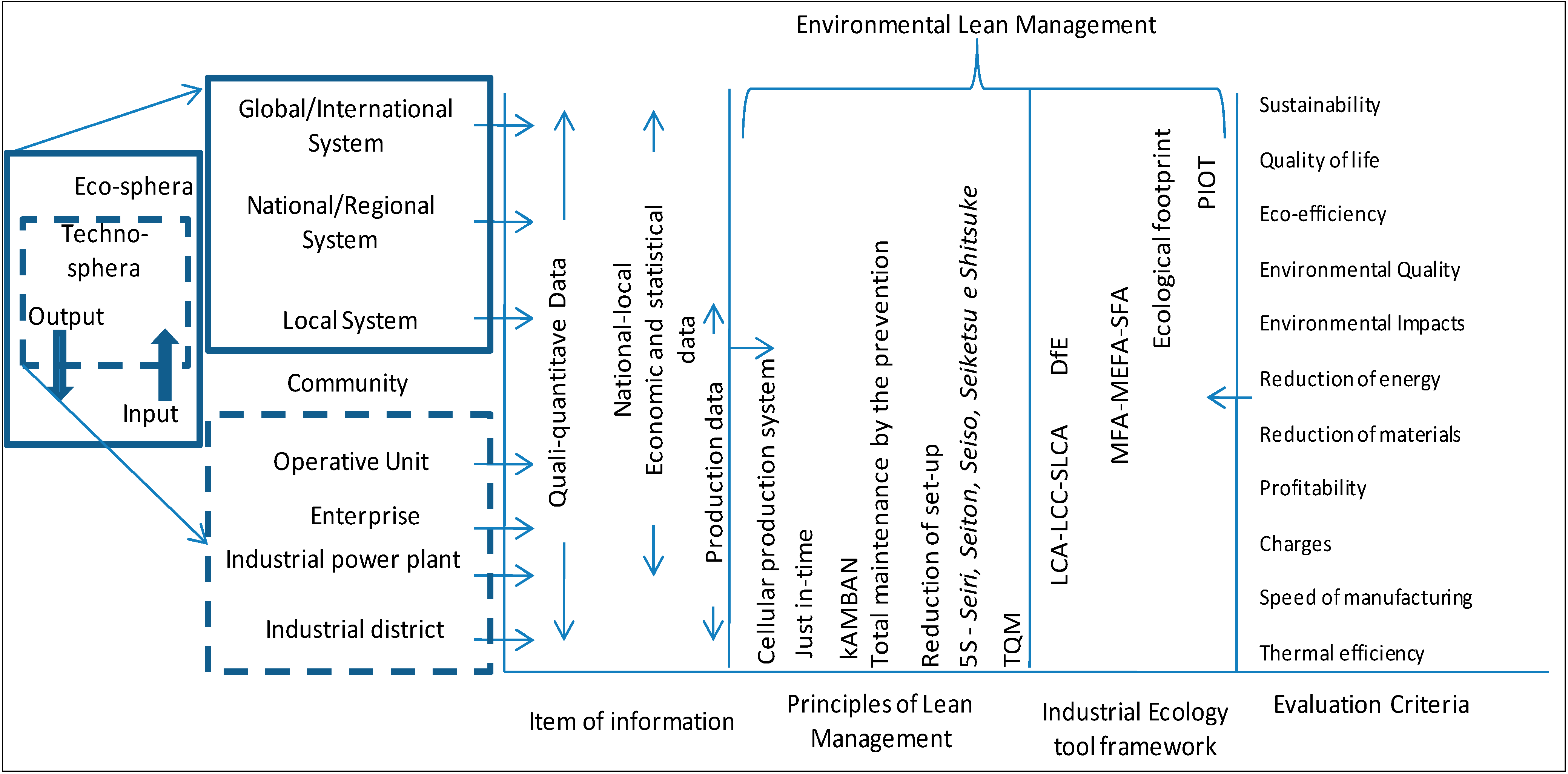 The IE is a paradigm for environmental management principles and makes use of tools for environmental analysis and the definitions of compatible choices. It can then be finalized by the interpretation of the transformation of the industrial system connected to the load capacity of the territorial system in which it is rooted. In this sense, the IE has been regarded as a broad holistic framework to guide the transformation of the industrial system towards a model of sustainable production.
