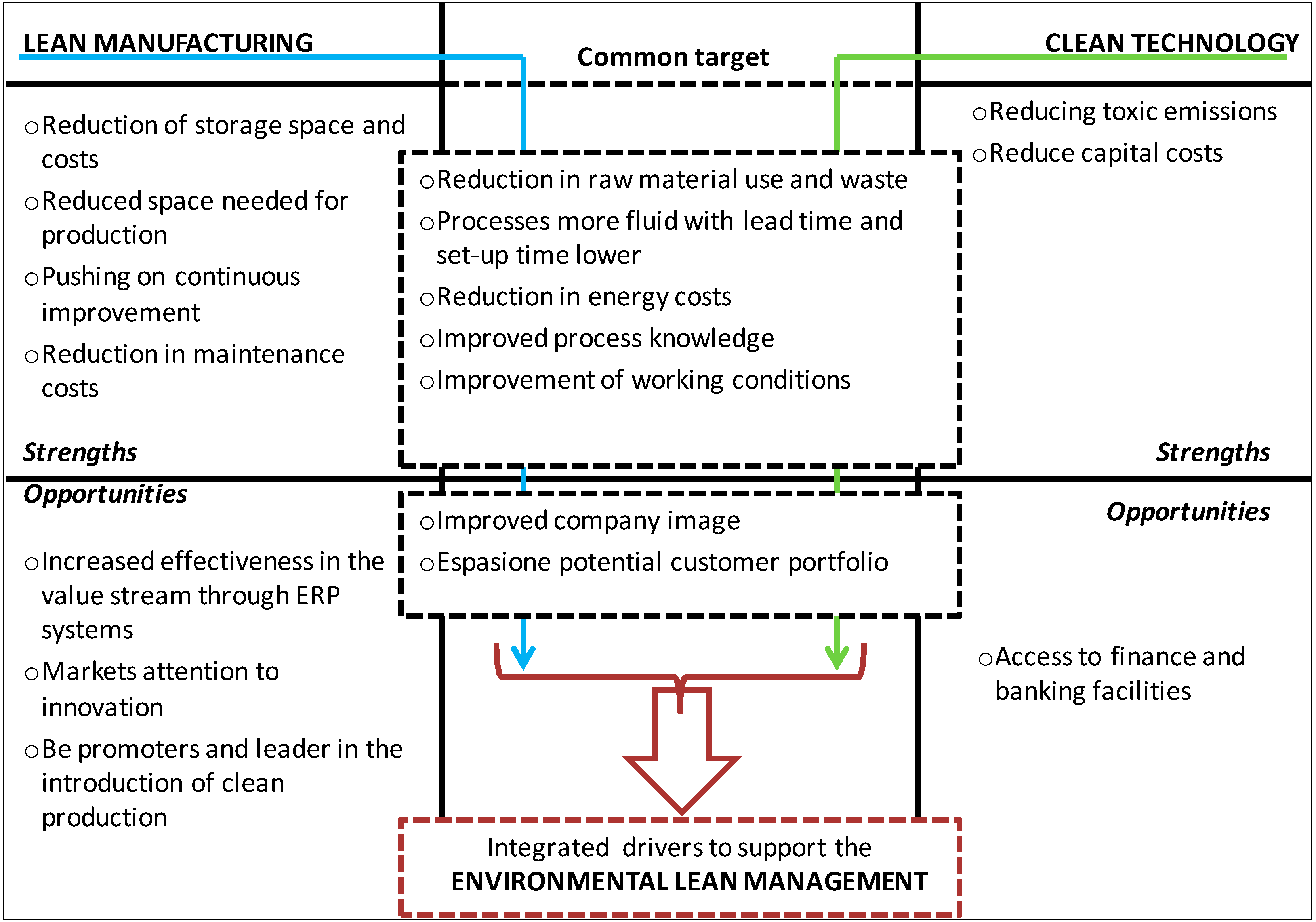 From integration of LM and CT strengths and opportunities, is possible to carry out the common targets’ need to push the launch of the Environmental lean management system (