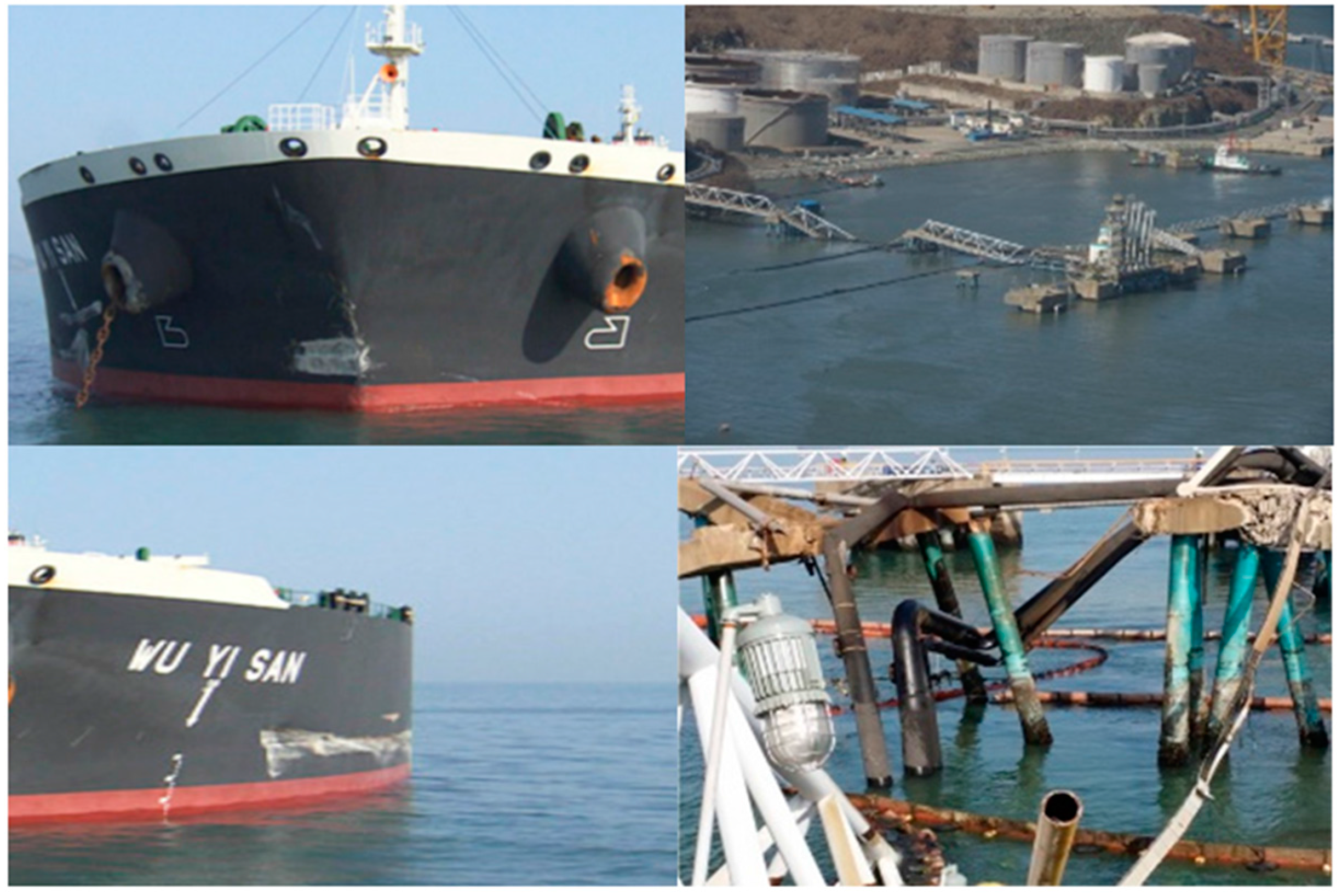 Photographs taken after the collision between the ship WUYISAN and the oil pier of GS Caltex Co. (Yeosu, South Korea).