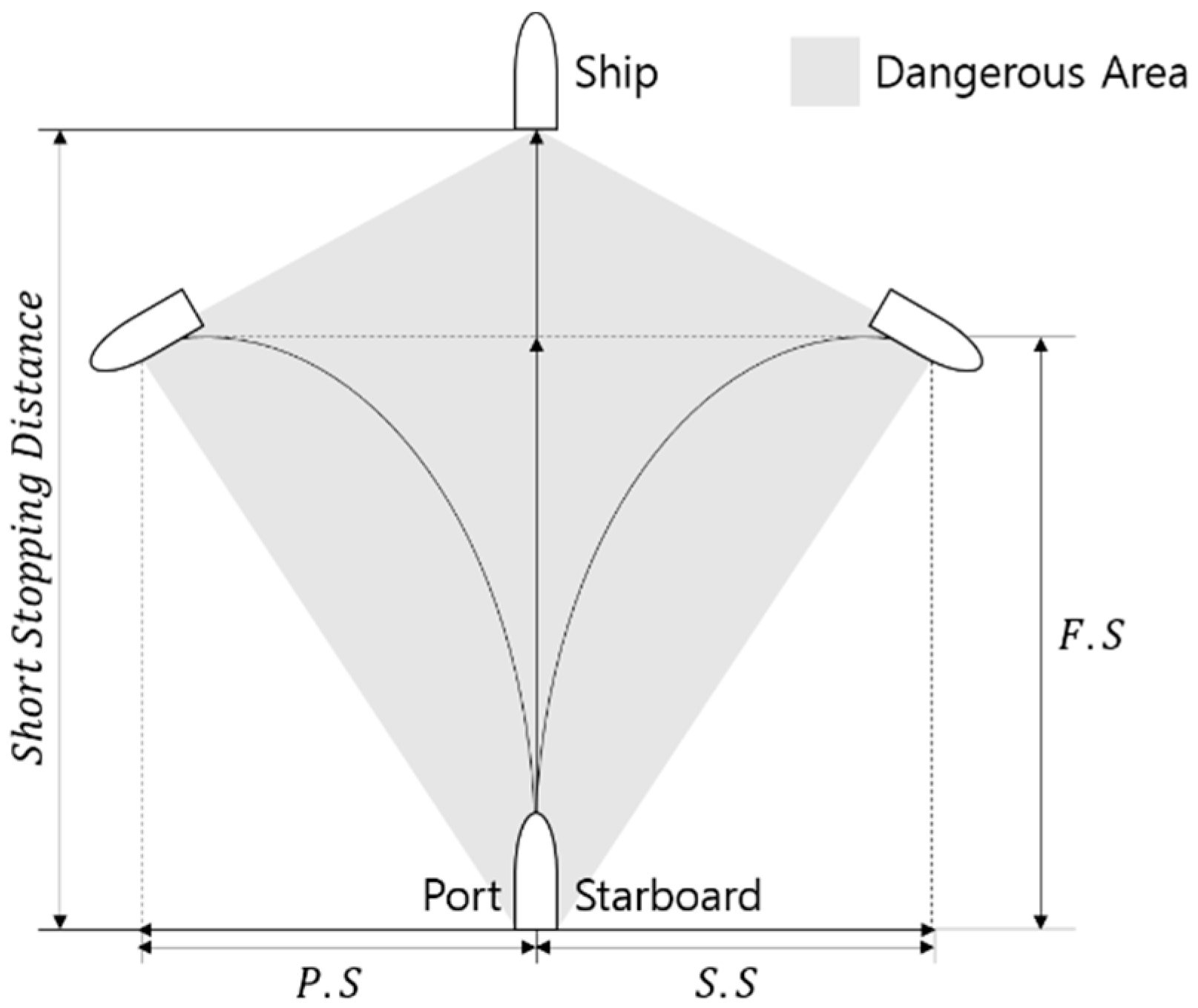 The forward component of the turning stopping distance is 0.75 times the shortest stopping distance, and the lateral component of the stopping distance is 0.5 times the shortest stopping distance [21]. For the uncertainty, the variable α was used. The stopping distance obtained by adding the calculated distance to α was used. The risk based area was drawn using the locations corresponding to the shortest stopping distance, the port or starboard turning stopping distances, and the end of the stern. The risk based area of the ship was pentagonal in shape, as shown in the shaded region of Figure 2.