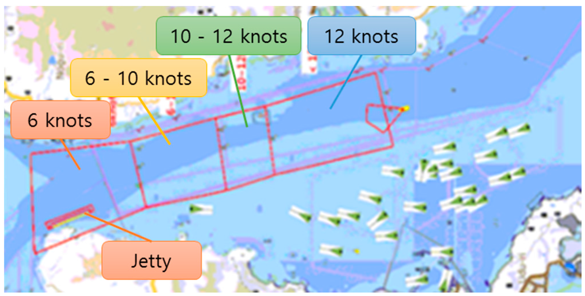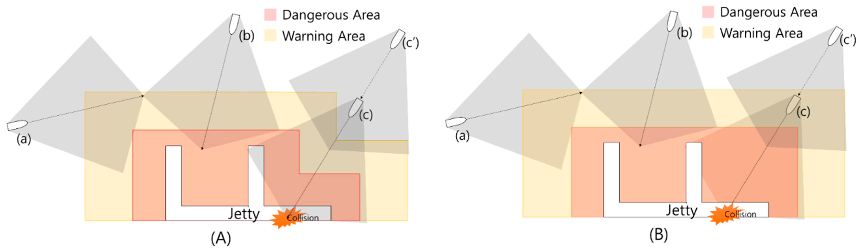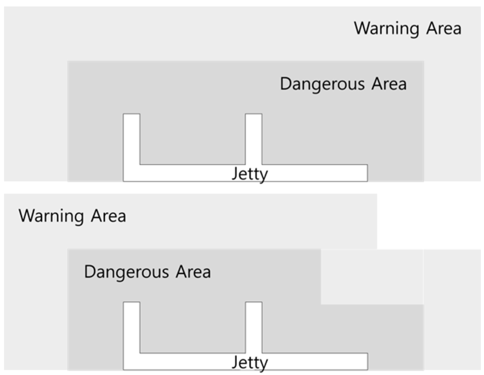 In contrast to the risk based area of a ship, the risk based area of a jetty is set by consultation between the managers, including system operators, managers responsible for safety, and officials of relevant ministry to enact rules and laws. This area is determined in consideration of such factors as the size of the ship, the size of the jetty, the structure of the jetty, and the item of acquisition. Because it is impossible to directly avoid the jetty when the ship approaches, the area was divided into two—the dangerous area and the warning area—which allowed for flexible coping according to the situation. The International Maritime Organization (IMO) proposed a regulation velocity according to the distance from the jetty [22,23]. The regulation ship velocity and distance specified by the IMO Standards of Training, Certification, and Watchkeeping for Seafarers (STCW) rules are shown in Table 2 [22,23]. After the accident involving the Torry Canyon ship near the coastlines of France in March 1967, the STCW was formed by the IMO as an international convention for providing international standards regarding crew certification. This convention sets goals regarding the safety of ships, the prevention of marine pollution, and the improvement of crew qualifications, along with suggesting standards for training, certification, and watchkeeping [24].