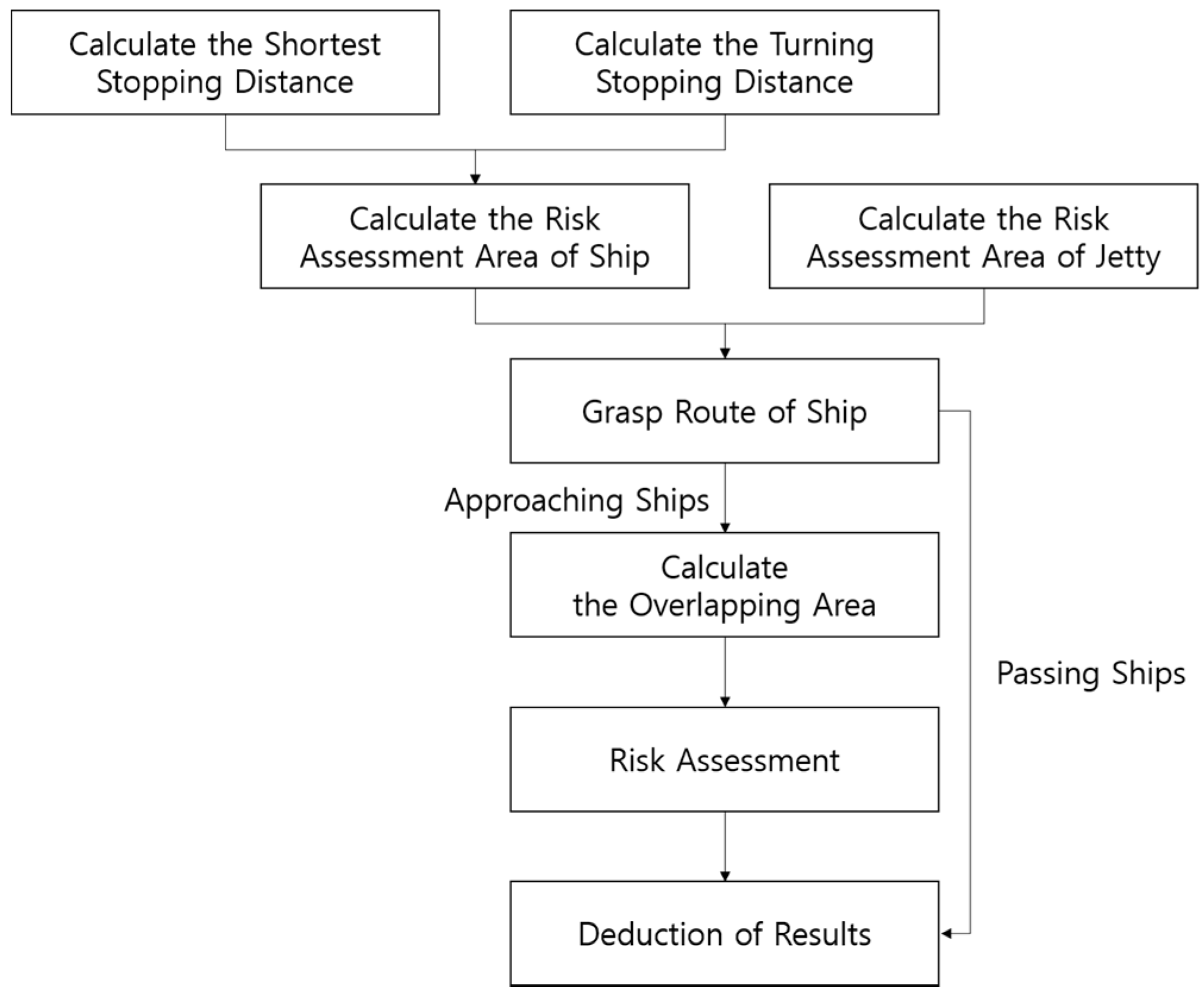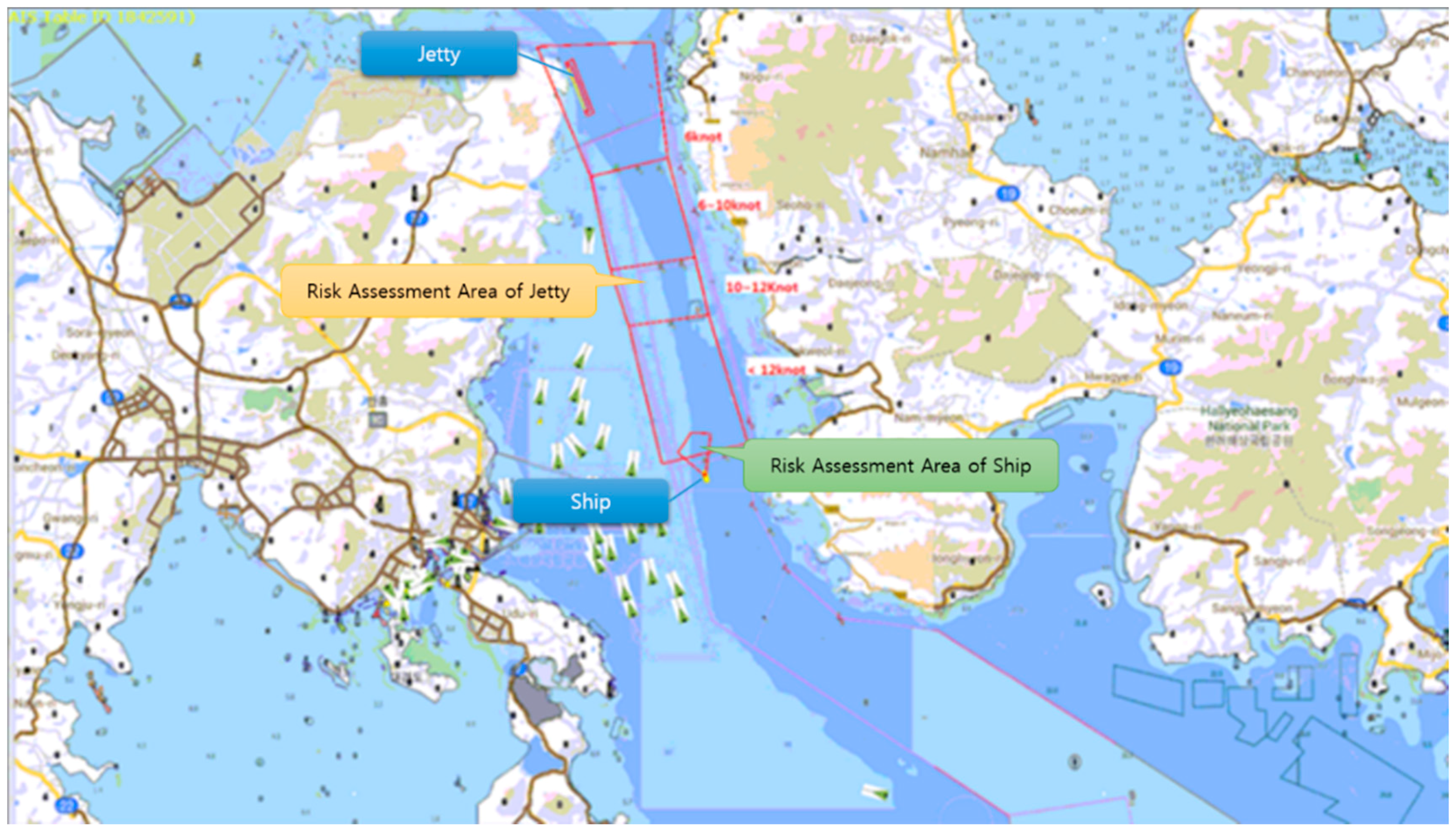 Risk assessment is performed according to the process shown in Figure 5. First, the shortest stopping distance and turning stopping distance are calculated by using AIS data for ships obtained in real time. The risk based area for a ship is then calculated using the two stopping distances, and that for a jetty is calculated considering the relevant conditions. Second, the overlap between the risk based areas of the ship and jetty is calculated. Finally, collisions between the ship and jetty are predicted by assessing the size of the overlapping risk based area, and the results are displayed.