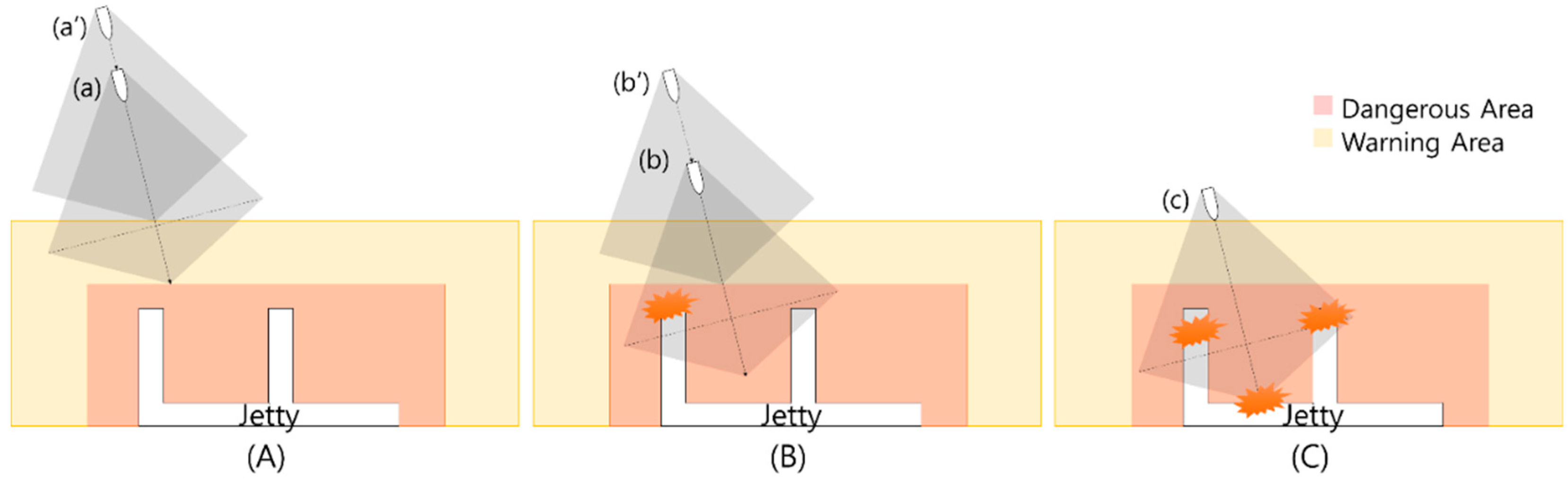 Risk assessment for a collision according to boundaries of risk based areas of a ship and a jetty; (A) represents the warning alert state, (B) represents the danger alert state, and (C) represents the collision state.