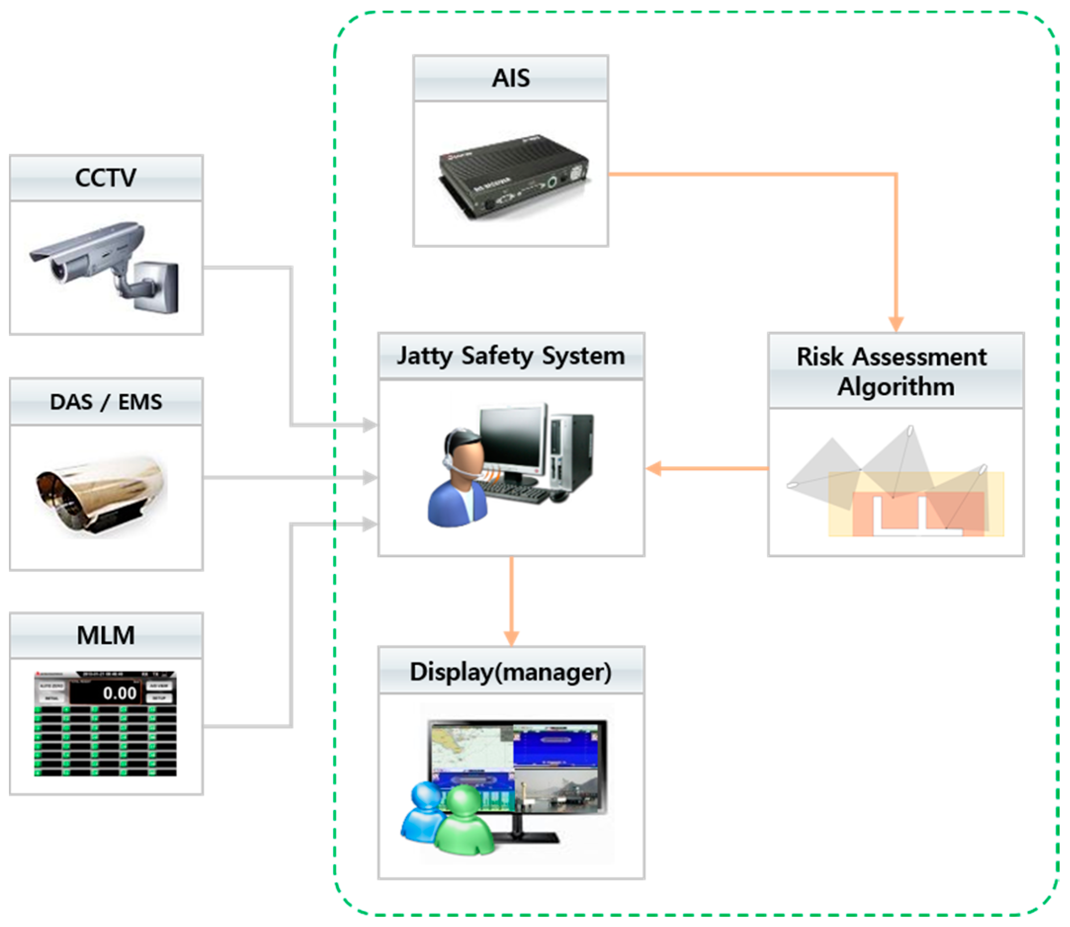 This paper suggests a jetty safety-monitoring system that consists of AIS for obtaining navigation information, a module for risk assessment, and a display for presenting the results. Figure 8 shows a jetty safety-monitoring system configuration applying the risk calculation method.