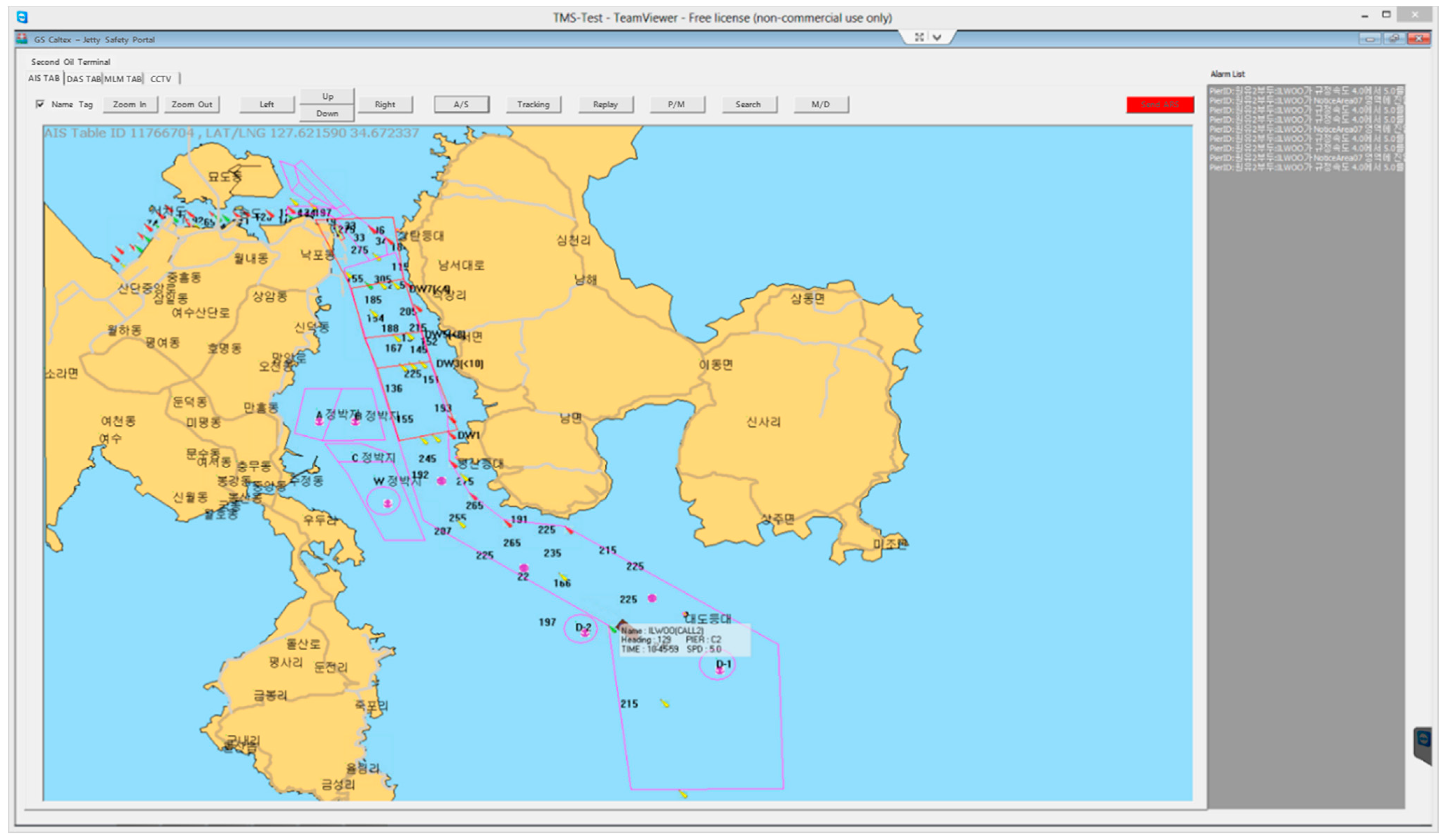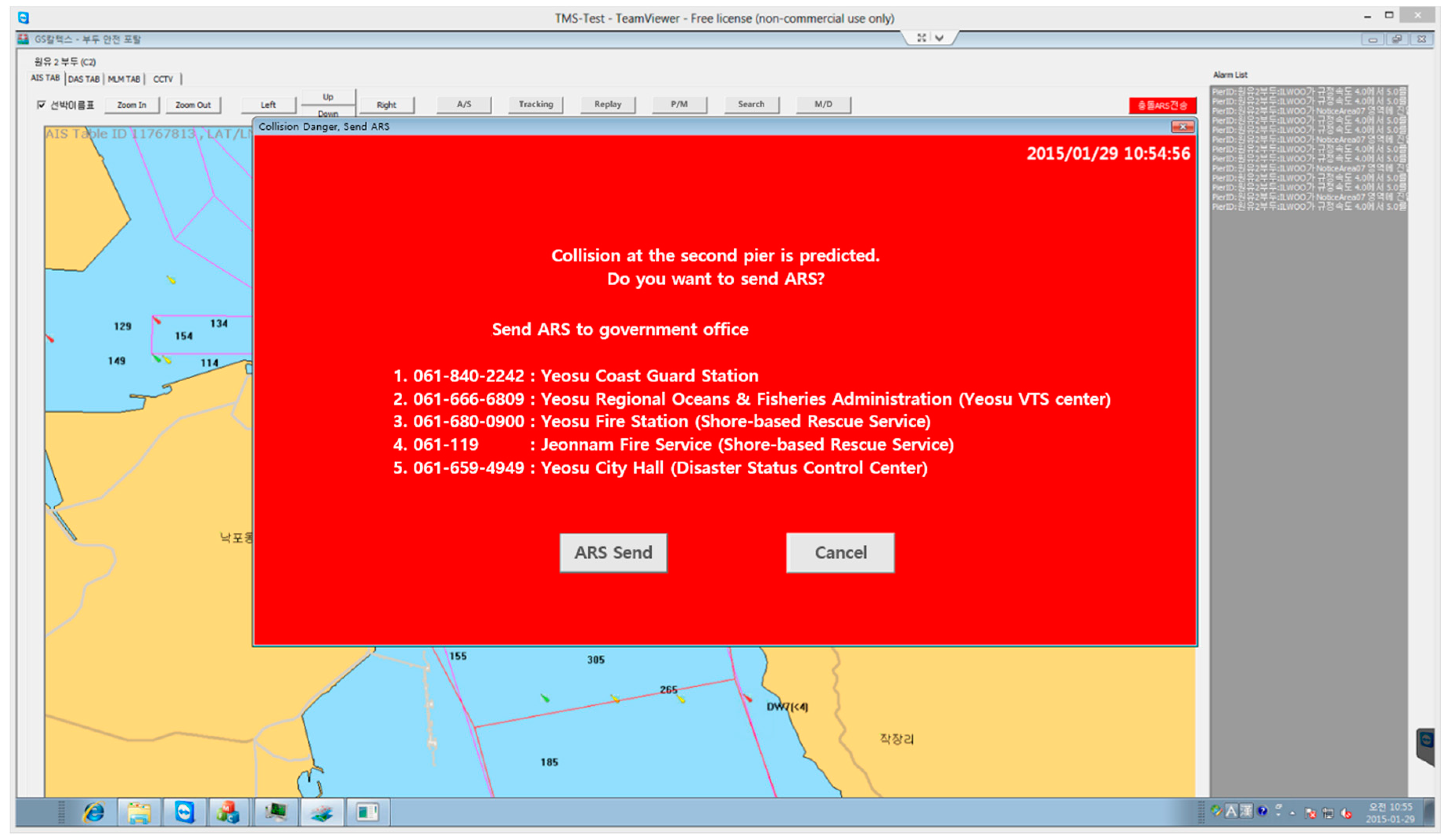 As the ship approached the pier, if it was located in the risk based area of the jetty set in accordance with the regulation velocity, or if a collision between the ship and the jetty was to be expected, a warning message was output. When a collision between the ship and the jetty was expected, the warning message shown in Figure 11 was displayed. This test was duplicated for many regions within the risk based area. The warnings are sent by a user. With a minimum of preventive measures to handle any warning generated by a system error, after the approval of the user at the jetty monitoring center, the warning system sends an alert.