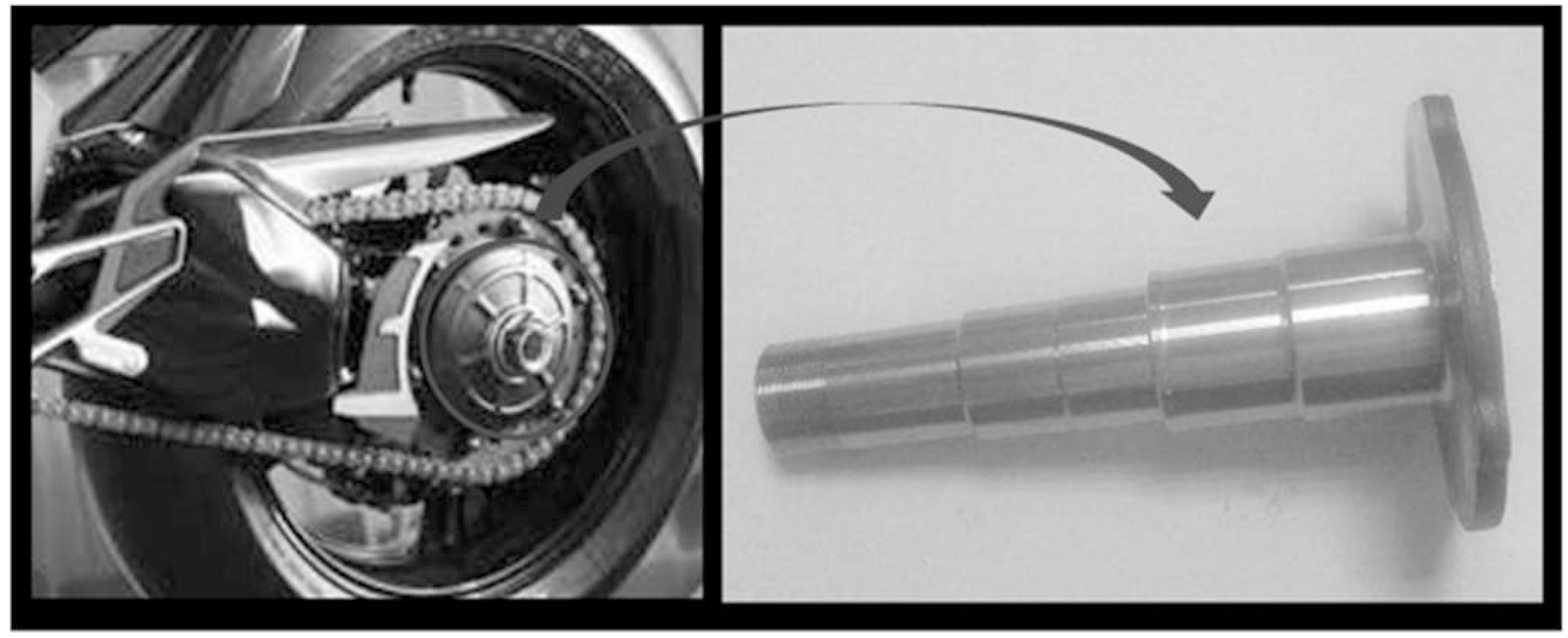 The spindle (Figure 2) is a critical component of the rear traction module of motorcycles, made from a steel alloy and having a final weight of 1.55 kg.