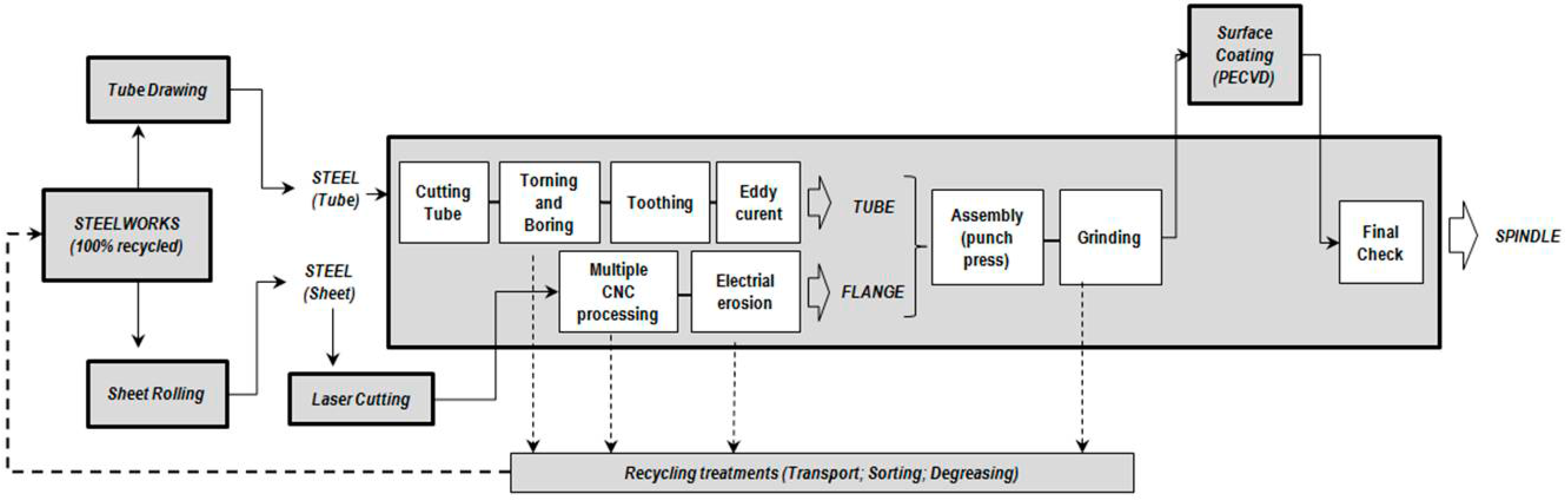 The eco-innovation analysed consists of a series of solutions aimed at: (i) improving the use of materials, resources and energy; (ii) eliminating or reducing the presence of toxic substances; (iii) increasing the recyclability of components and materials, thus obtaining economic benefits resulting from the greater overall system efficiency. The solutions proposed mainly concern the process concept of the spindle, some machining steps and the surface treatment. Such eco-innovations are included in an improved product system scenario, which is compared to the conventional version, described above (Figure 3).