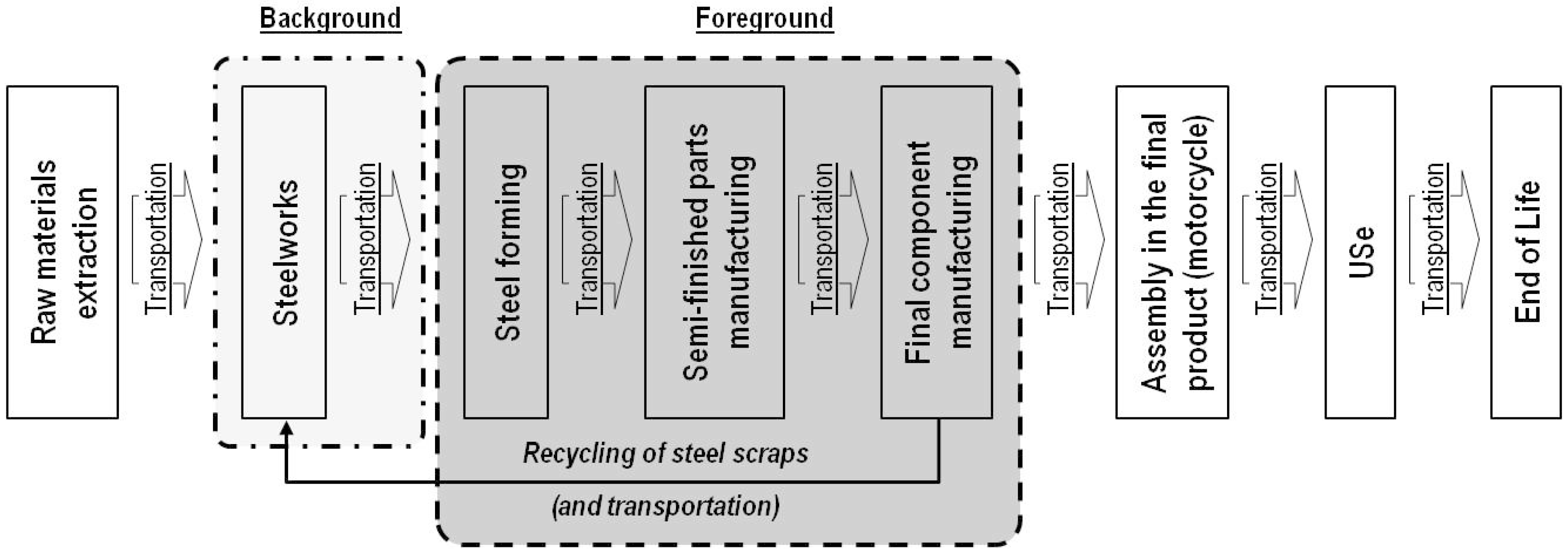The system boundaries start from the steelworks, and end with the obtainment of the final product—the spindle—as a component of motorcycles (cradle to gate approach) (Figure 5). The following stages were excluded from the system boundaries: extraction of raw materials, being the spindle obtained from 100% recycled steel, and the assembly, use and end of life stages, as they are considered irrelevant for the purposes of this study, being the finished product identical in the two versions. The functional unit selected is one item of spindle and the reference flow is one unit of product for each option considered.
