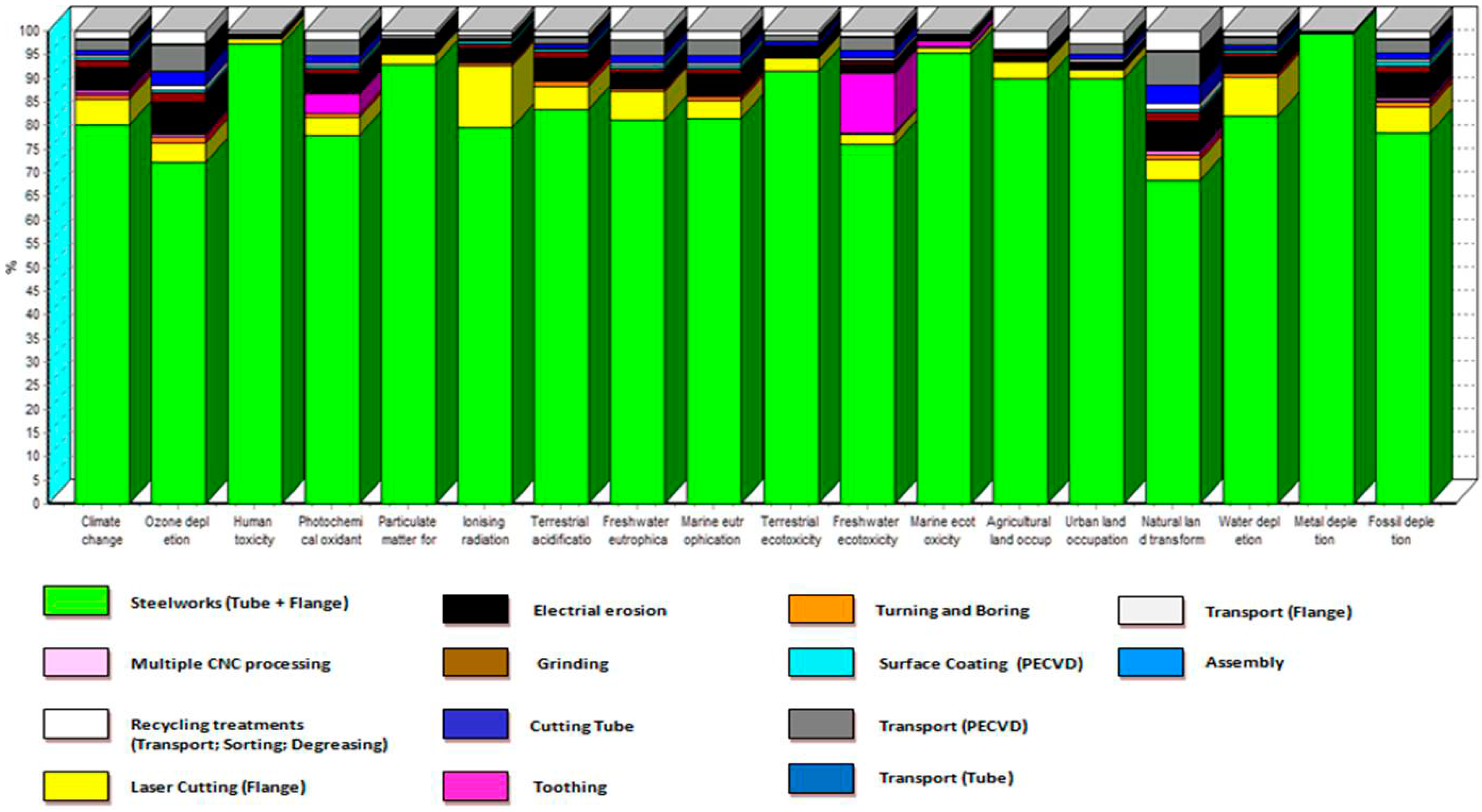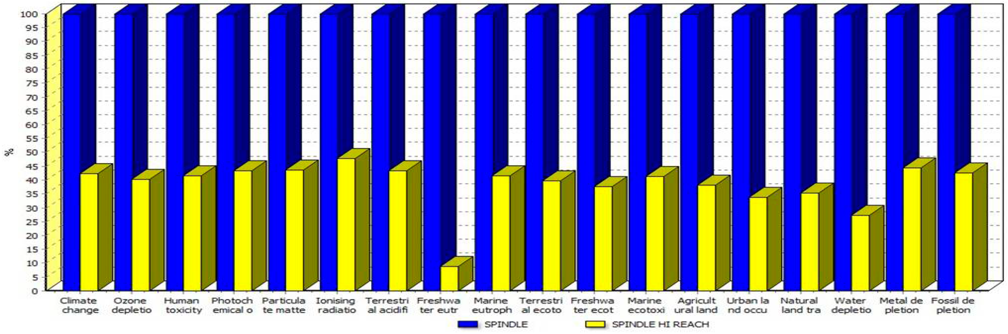 Such variations become more evident (–90%) for the Freshwater Eutrophication indicator. The improved performances could be mainly referred to a reduction in terms of material flow (mainly steel) managed within the product system: in the conventional process, indeed, the Spindle is obtained starting from a bar of forged steel, whilst in the Hi-reach process it is obtained starting from a tube and a flange. The different process concept results in a reduction of the mass of steel managed, handled and processed along the supply chain, for each spindle, from 5.004 kg to 2.22 kg. Another issue that could contribute to the overall significant environmental improvement is the different surface treatment, involving the PECVD technology, which avoids the environmental issues traditionally related to surface treatment, such as freshwater consumption, emission of toxic substances, treatment of sludges. Other differences can be recognised in the metal machining steps, especially in the elimination of forging activities in the first part of the process. In Figure 7 and Figure 8, percentage contributions of each process unit to the environmental performances of the component of the Hi-reach project are summarised.