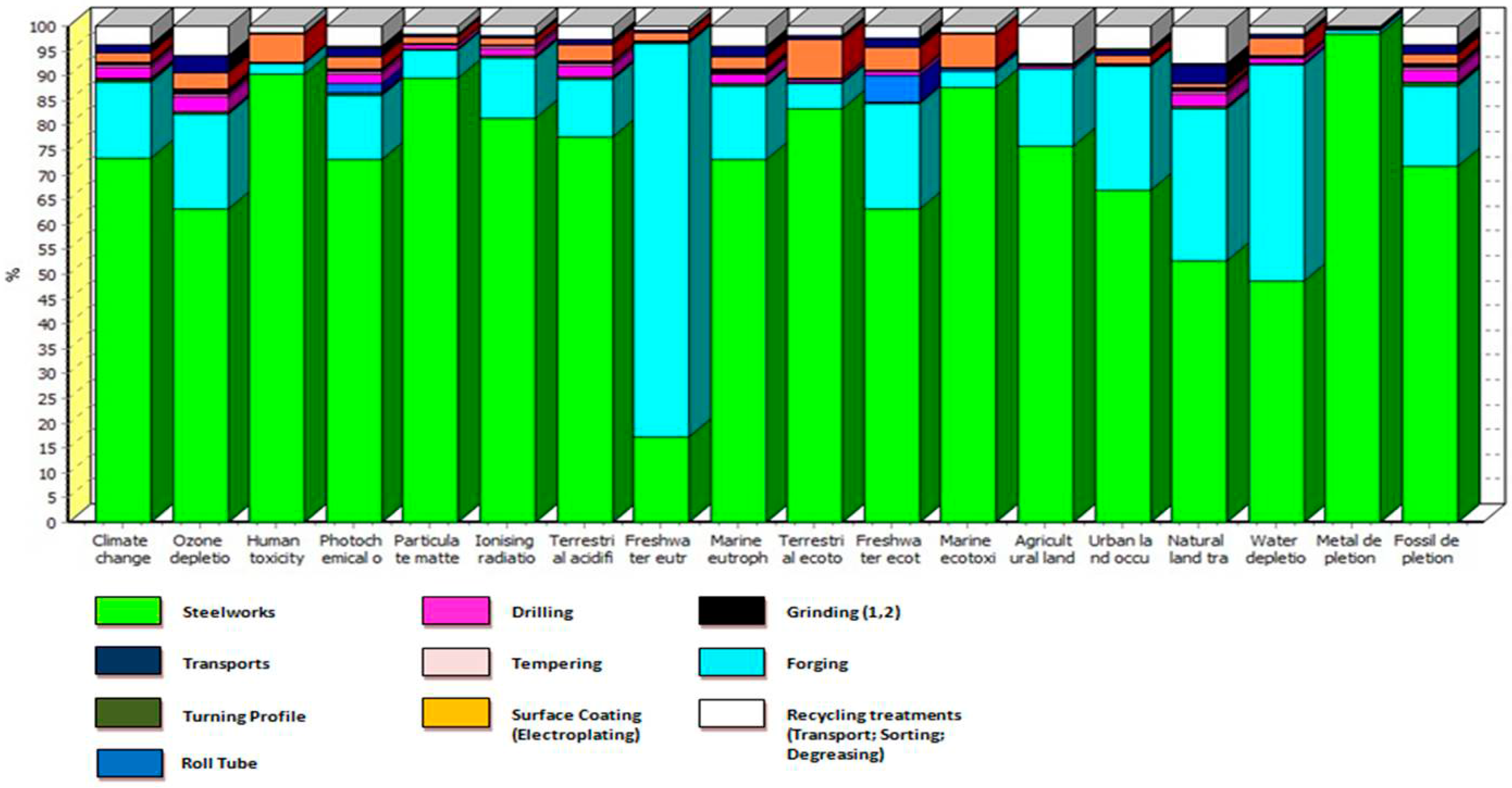 Life Cycle Impact Assessment—The LCIA method used was ReCiPe 2008 [38], which was considered the most updated one at the time of the project, capable of integrating the damage-oriented and the problem-oriented approaches and including the greatest number of impact categories at the intermediate level (midpoint).