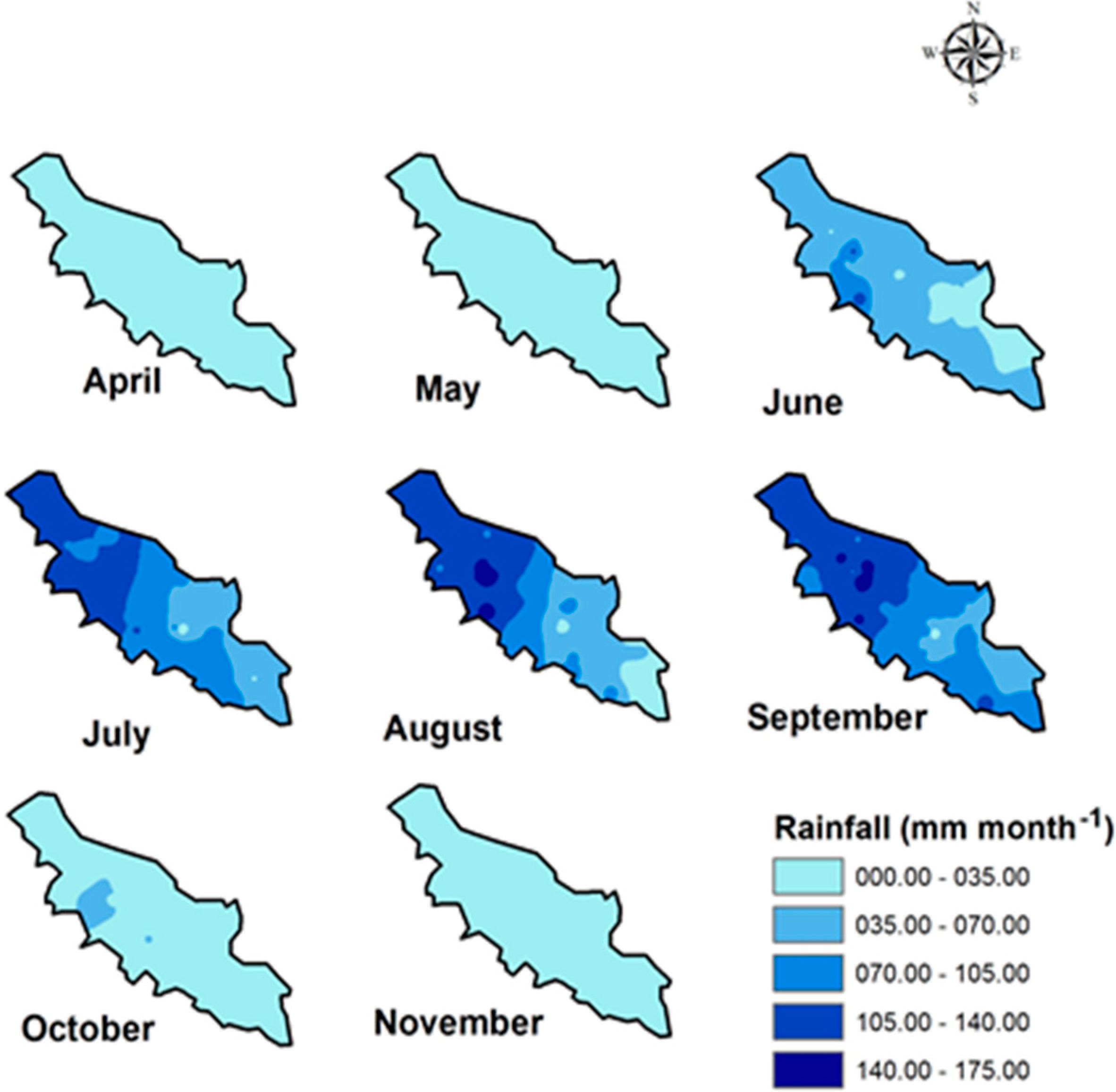 The average meteorological conditions from 2006 to 2011 between April and November are presented in Figure 3, covering the 35 weather stations used in this research. Average air temperature was 18.4 °C; minimum and maximum air temperature values were 10.4 °C and 26.7 °C. Vapor pressure deficit (VPD) ranged between 0.38 and 1.98 kPa, with an average value of 1.27 kPa. Average wind speed was 6.7 m·s−1. Monthly ET0 ranged between 113.4 and 198.1 mm·month−1 in the study period. Daily average ET0 was 5.03 mm·day−1. The total average rainfall was 358.3 mm. The minimum and maximum average rainfall were 3.5 mm·month−1 in November and 94.5 mm·month−1 in September. A large share of precipitation occurred from June to September (88.6%). Figure 4 and Figure 5 present the time evolution of average ET0 from April to November (covering the crop season). According to information plotted in Figure 4, the lowest ET0 values were found between the months of September and November (75–120 mm·month−1), representing only 40% of the ET0 computed for the period April to May (200–290 mm·month−1), when the highest ET0 values were recorded. Figure 5 shows the average monthly rainfall in the crop Primary Region of Mexico. The maximum precipitation values were observed in July, August, and September (35–175 mm·month−1), while April, May and November accounted for 11.1% of the maximum monthly precipitation value. Regarding the spatial distribution of ET0, this variable was relatively uniform in the analyzed region for the entire studied period. However, in some months (April, May, September, and November) the northwestern region showed an ET0 increase of 29% in relation to the southeastern region (Figure 4). As for the distribution of precipitation, the values obtained in April, May, October, and November are uniformly spread, reaching 70 mm. From July to September, precipitation was relatively lower in the southeastern region, with 35–140 mm vs. 70–175 mm in the northwestern region.