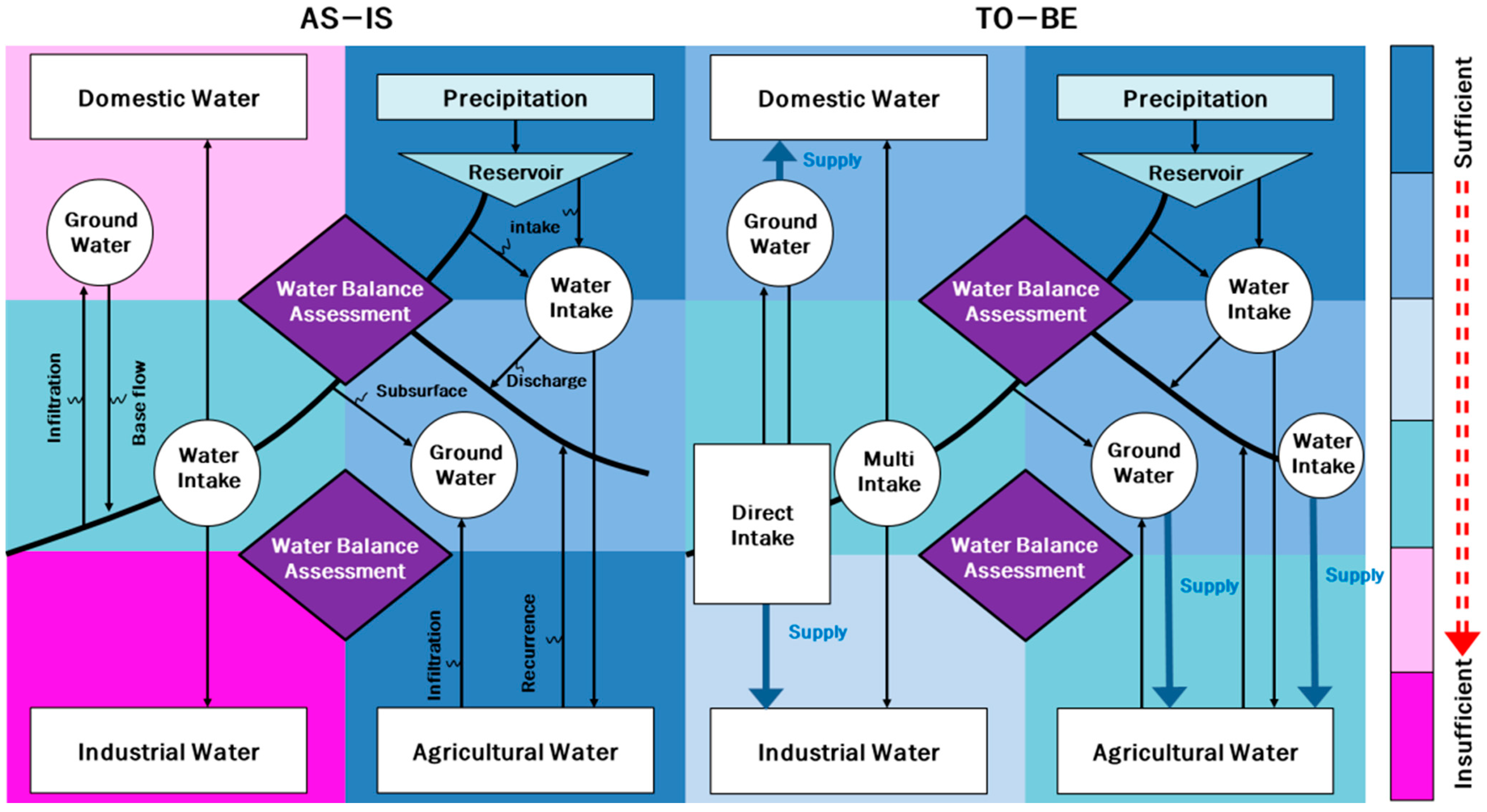 If the value of WB in Equation (1) is more than zero as ordinary state of water supply, the system shows only a general state of water cycle in the target area and this general procedure in the ordinary water supply system is illustrated in Figure 8. The concept of water distribution is basically the same as the current system, but the control system is added and the use of alternative water resources is included.