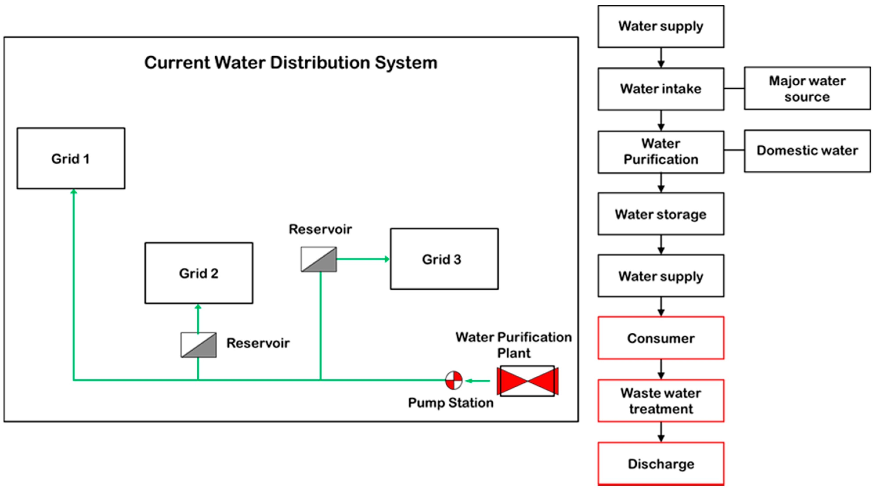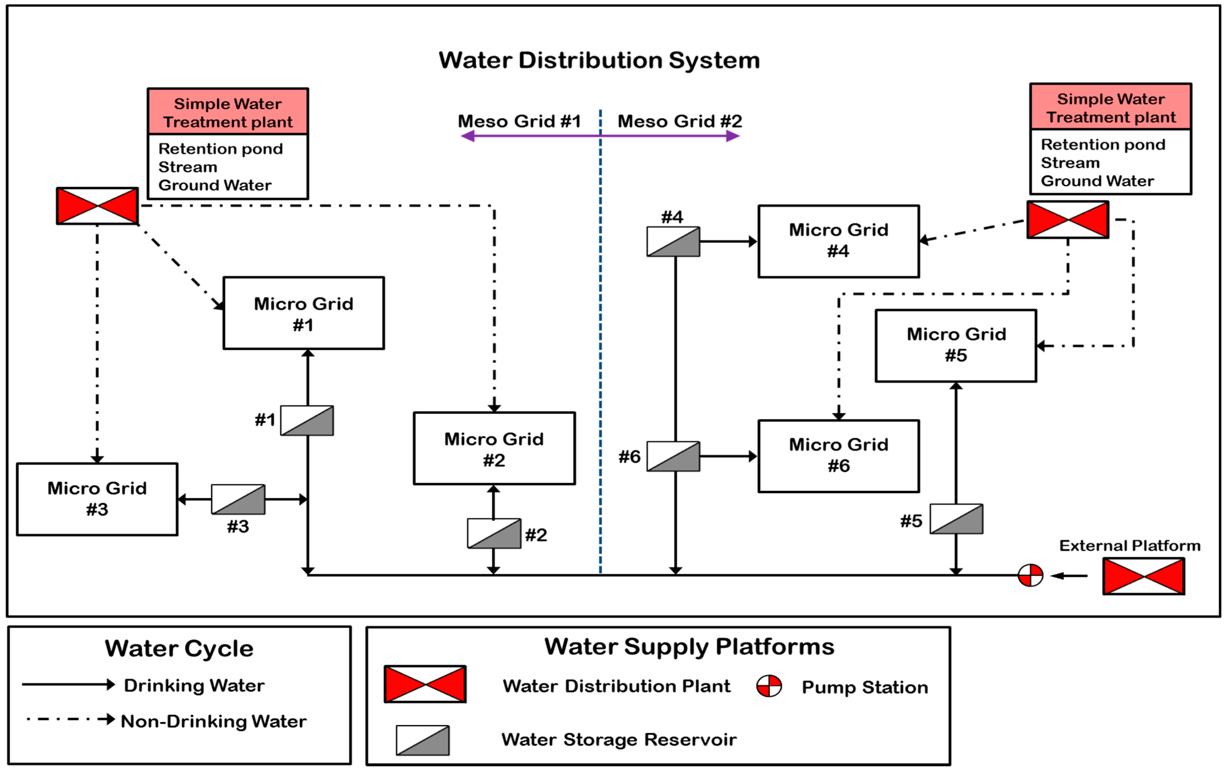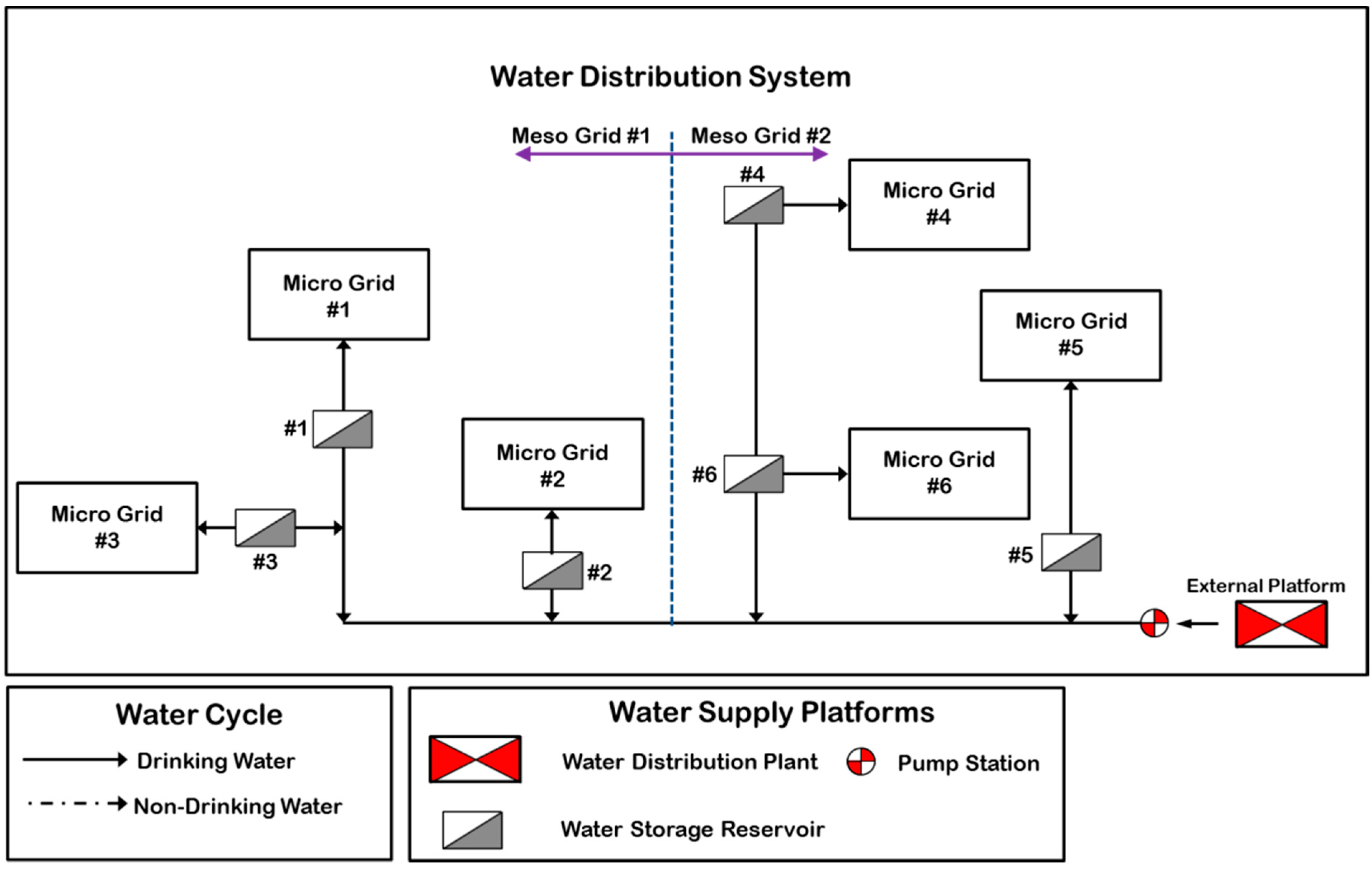 Mainly, the water from the water distribution system is supplied to the target grid by storing it in the water storage reservoir and each grid should have its own reservoir to make the water supply more stable, as shown in Figure 5. Water storage reservoirs have their own capacity to buffer the water cutting off problem and they must cover the water supply for 6–24 h at an emergency state, without any external water supply.